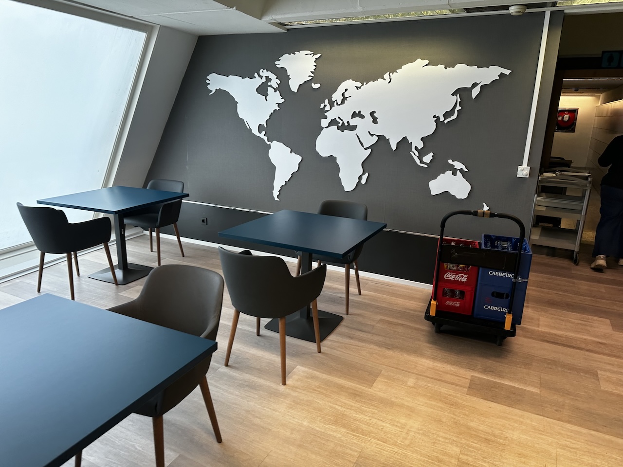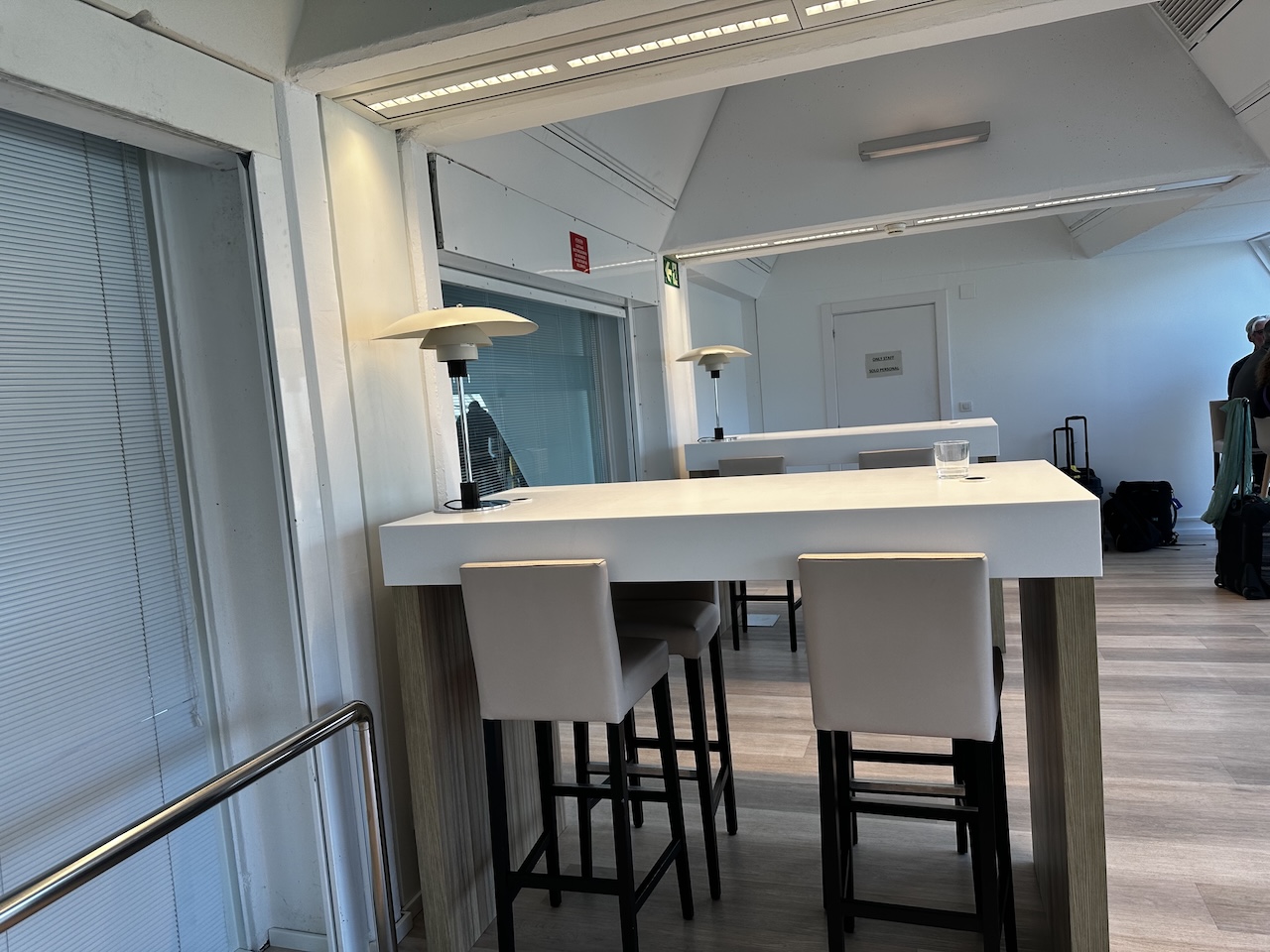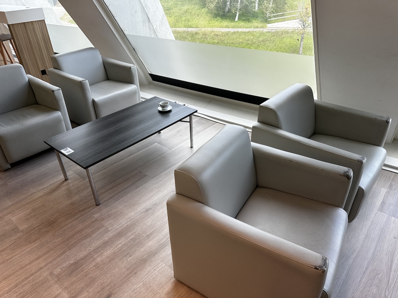 Für die Besucherinnen und Besucher stehen verschiedene Sitzgelegenheiten wie Sessel, Stühle und Barhocker mit Hochtischen zur Verfügung. In den Raum kommt dank der Fensterfront auch Tageslicht rein, von hier kann man allerdings nicht aufs Vorfeld blicken.