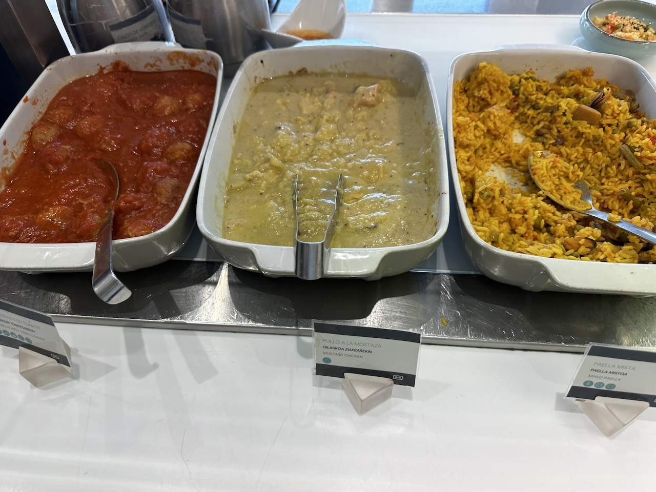 In Bilbao werden auch einige warme Optionen bereitgestellet, heute waren es Hühnchen in Senfsoße, Hackfleischbällchen mit Tomaten und ein Reisgericht.