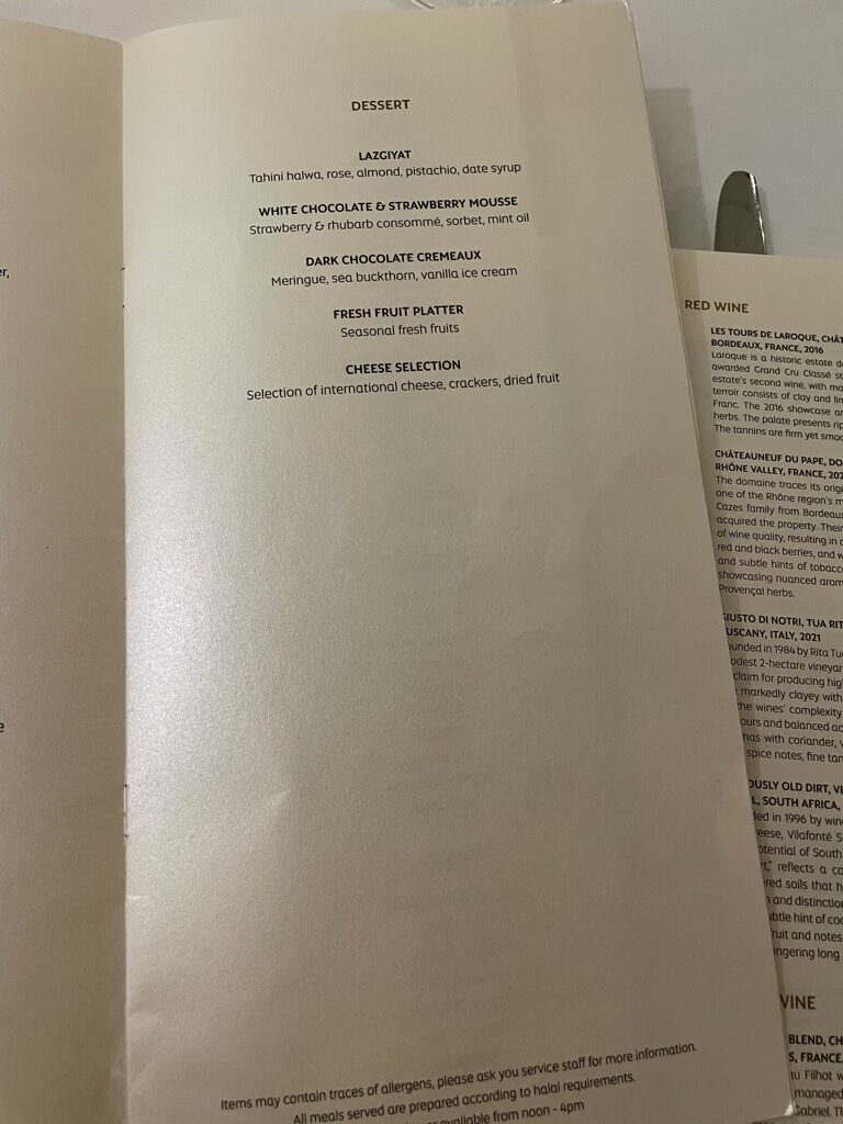 Ein kleiner Wehrmutstropfen war dann aber die geschmorte Rinderrippe, die man als nichts anderes als „fantastisch“ bezeichnen kann. Sowohl geschmacklich, als auch von der Präsentation der Speisen konnte Etihad Airways hier auf voller Länge punkten.