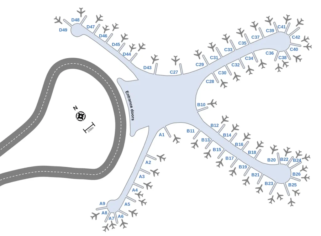 Mir wurde bereits beim Check-In gesagt, dass die Lounge sich zwischen Gate C27 und D43 befindet. Was mich erst einmal sehr überrascht hat, wurde dann doch irgendwie deutlich, als ich einen Blick auf die Gate Map des neuen Terminals geworfen habe. Die D und C Gates laufen bei C27 und D43 zusammen.