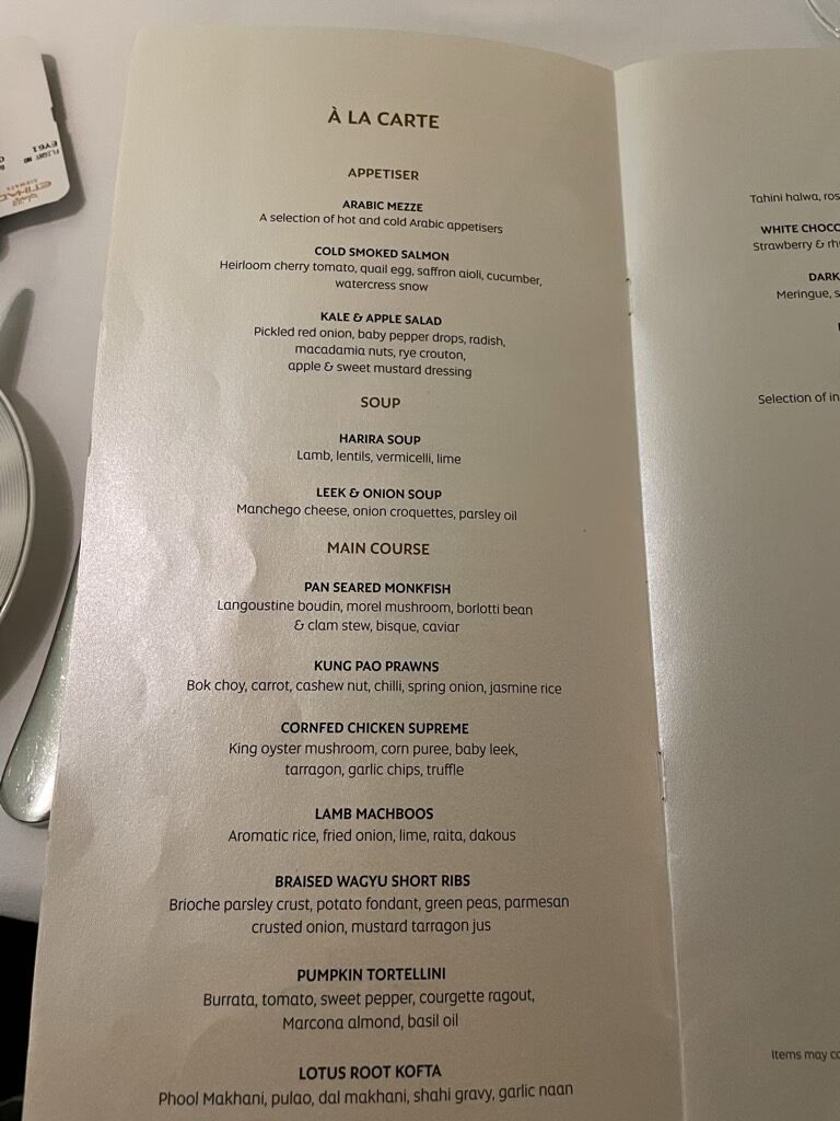 Die Qualität der Speisen fand ich super und einmal mehr zeigte Etihad Airways was man im F&B kann. Ein wenig Nachholbedarf hat man vielleicht aber im Training des Personals, denn eine minimale Pause zwischen den Gängen hätte hier sicherlich einiges gebracht, wobei ich hier den Damen und Herren unterstellen möchte, dass vielleicht etwas „lost in Translation“ war und man mich möglichst schnell bedienen wollte, entgegen der eigentlichen Absprache.