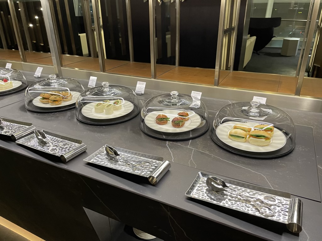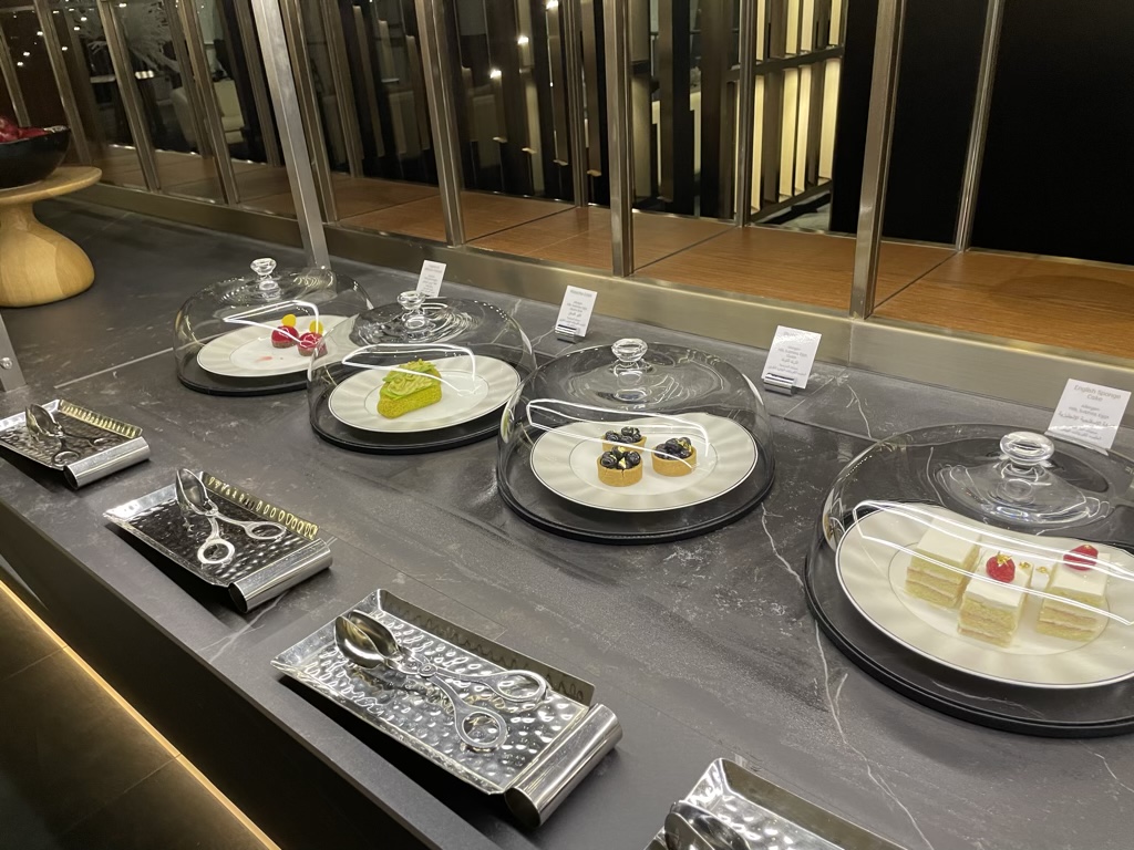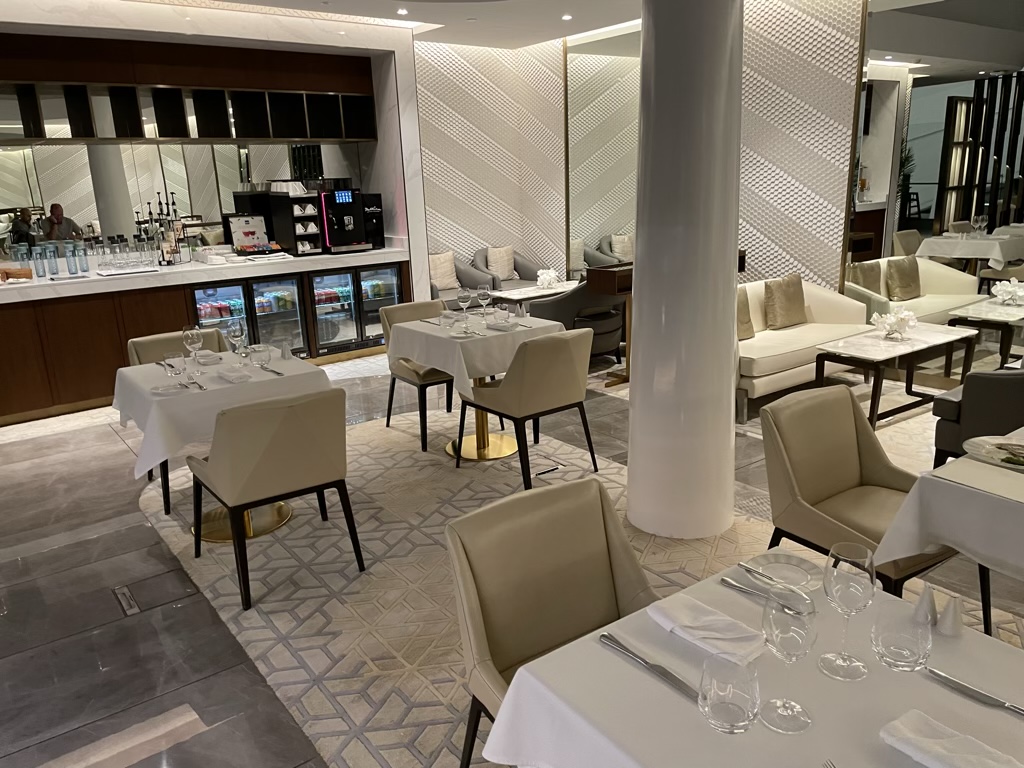 Direkt nach diesem ersten Lounge Bereich befand sich auch schon auf der rechten Seite eine erste Dining Area. Neben Sitzgelegenheiten gab es hier auch noch ein kleines Buffet, was wohl aber mehr aus Show Zwecken hier zu sehen ist, denn das eigentliche Angebote an Speisen und Getränken wird komplett a la carte serviert.