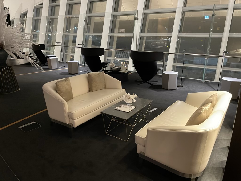 Direkt nach dem Eingang kommt man in einen Bereich mit verschiedenen Lounge Areas in denen man auf Couches und Sesseln verweilen kann. Niedergelassen hat sich allerdings kein Gast dort, was zeigt wie leer die Lounge war.