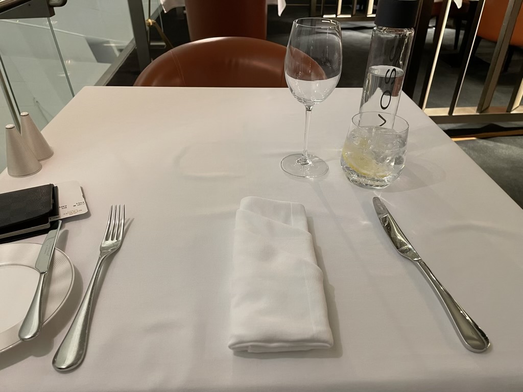 Kaum hatte ich mich an den Tisch gesetzt, wurde ich auch schon gefragt ob ich alleine Essen werde, worauf hin das zweite Gedeck entfernt wurde. Auch wurde mir direkt Wasser gebracht und kurz darauf meine Bestellung aufgenommen. Stilecht und vor allem teuer wurde mir hier eine VOSS Wasser Flasche aus Norwegen an den Tisch gestellt, wie gewünscht mit Eis und Zitrone