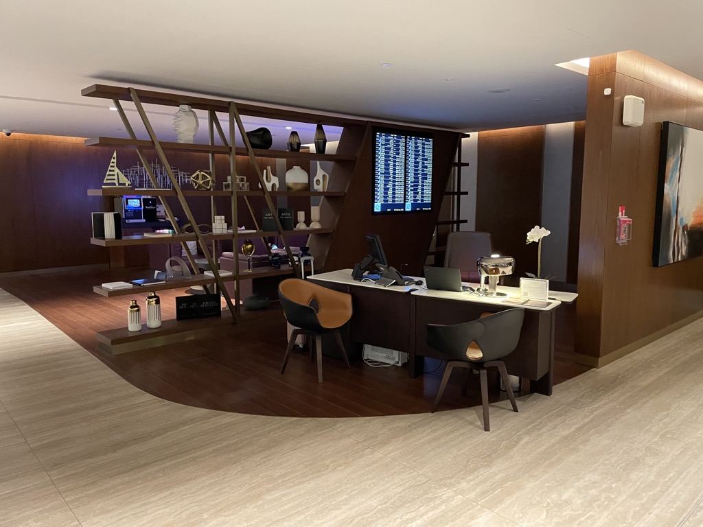 Am Ende der Lounge findet man auch einen Service Desk. Dieser war zwar nicht besetzt und ich bin mir nicht ganz sicher was man hier wirklich für die Passagiere machen kann, aber er war definitiv wunderschön gestaltet. Auch wurde es in dieser Ecke der Lounge deutlich ruhiger und man fand noch einige freie Sitzplätze.