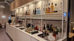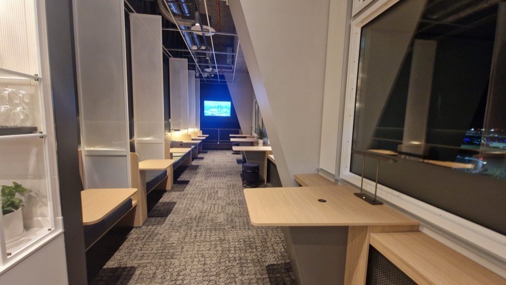 Es gibt auch zwei schallgeschütze Kabinen, in denen man Meetings abhalten kann. Die Arbeitsbereiche und Lounge-Tische sind jeweils mit Strom- und USB-C-Steckdosen ausgestattet. Das Essens- und Getränkeprogramm ist das Gleiche wie in den anderen Lufthansa-Lounges. Kostenlose Zeitungen und Zeitschriften runden das Angebot ab. Die Lounge bietet einen schönen Ausblick auf den Flugbetrieb.
