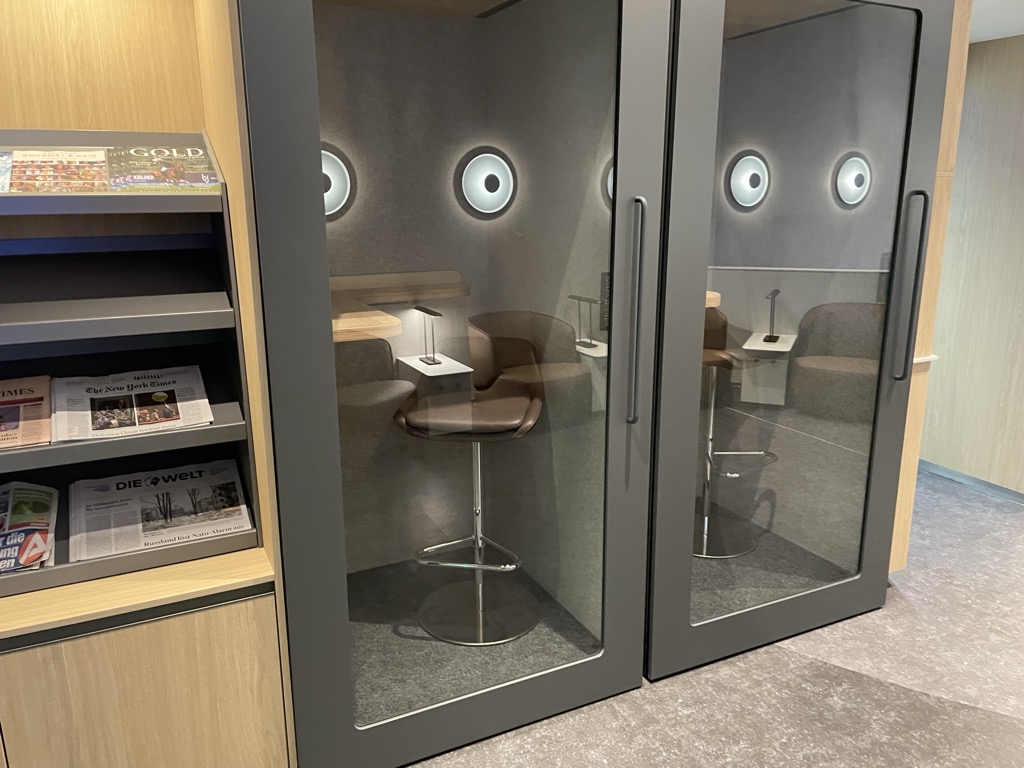 Auch auf die arbeitende Bevölkerung auf einem Business-Trip zugeschnitten sind sicherlich die drei schallisolierten Kabinen am Ende der Senator Lounge. Hier kann man ungestört und vor allem auch ungehört telefonieren, was ich sehr angenehm finde, denn ich habe immer sehr wenig Interesse, die „streng geheimen Neuigkeiten“ des Nebenmanns am Telefon lautstark in der Lounge mitzuhören.
