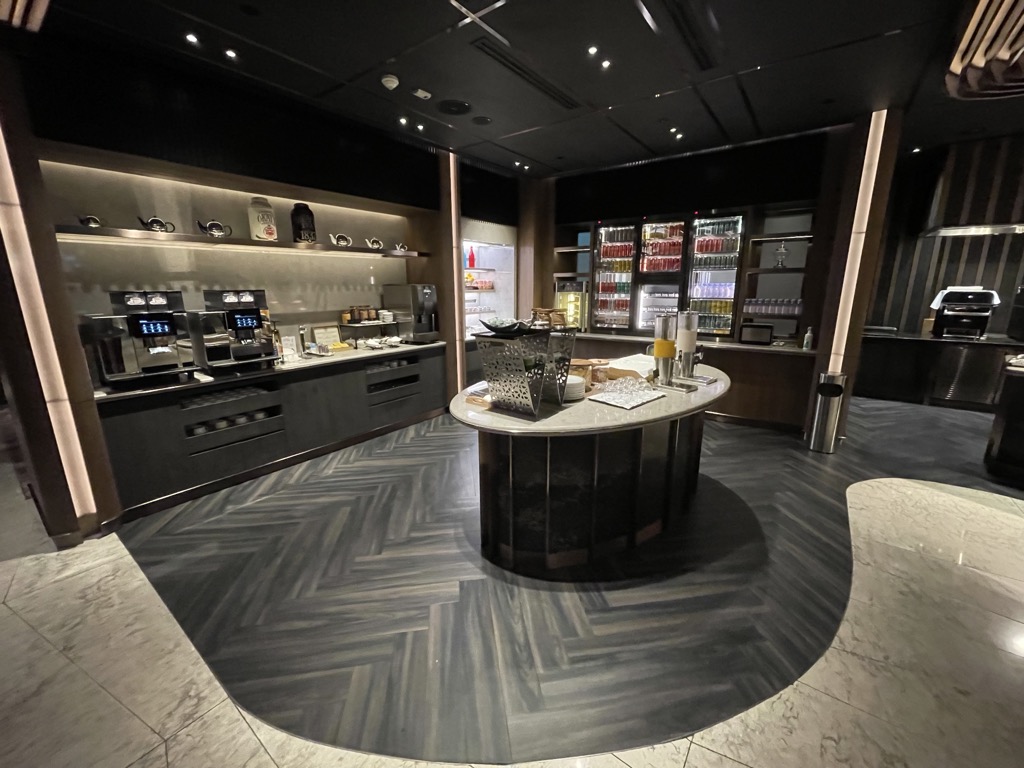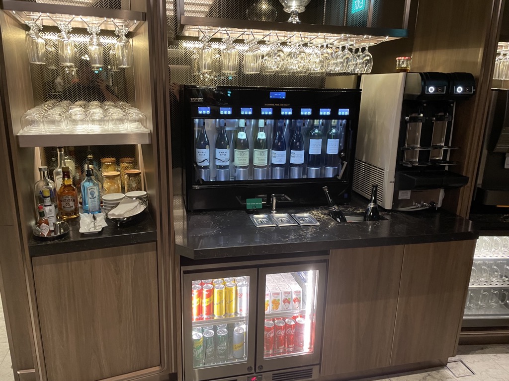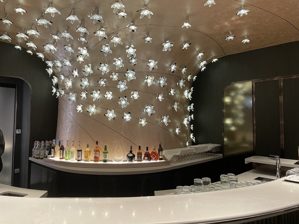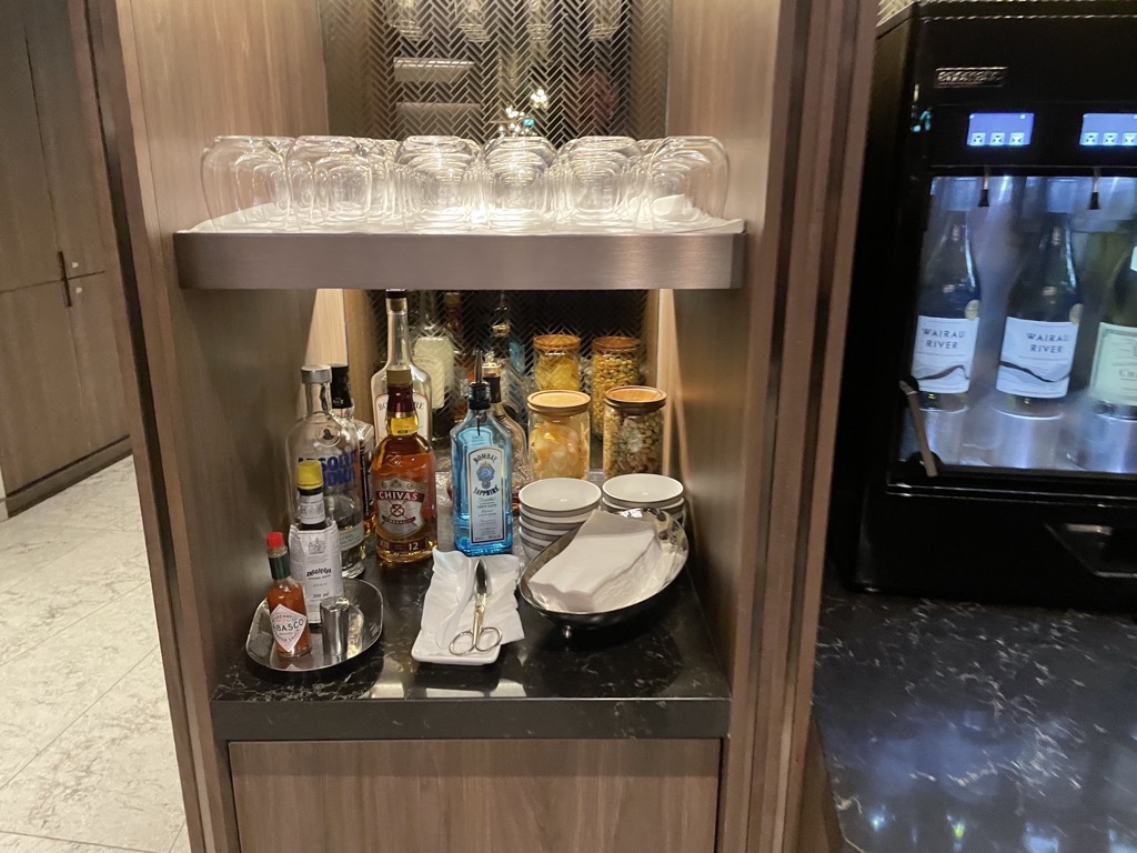 Direkt nachdem man die Singapore Airlines First Class Lounge betritt, fällt die große und wunderschön gestaltete Bar ins Auge. Hier kann man sich den Tag über Cocktails mixen lassen und am Morgen bietet man guten Batista Kaffee.