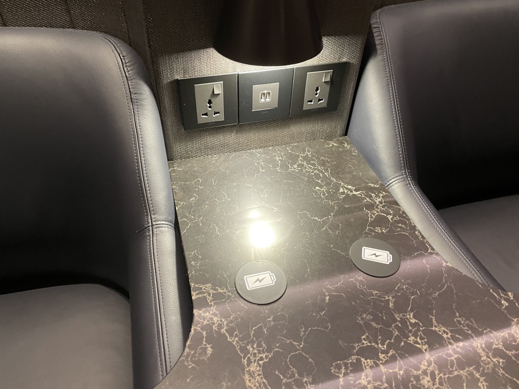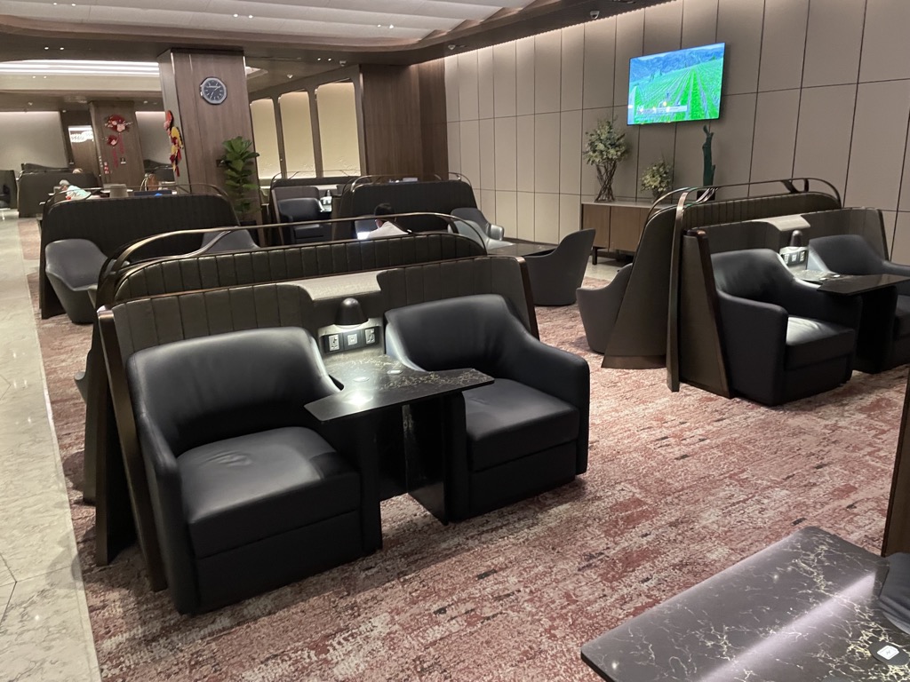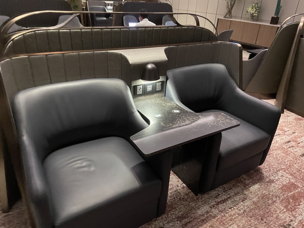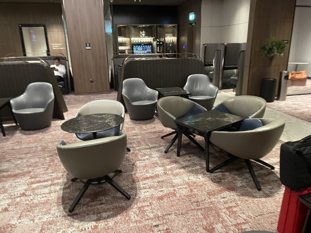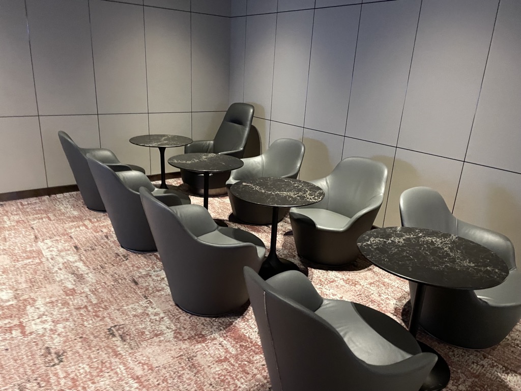 Daneben gibt es in der Lounge vor allem noch Sessel in verschiedenen Sitzgruppen und Ausführungen, wo man gut verweilen kann. Dabei ist mir sehr positiv aufgefallen, dass es hier an jedem Platz gleich mehrere Steckdosen gibt und auch das WLAN war schnell und stabil. Nur dass es in der First Class Lounge tatsächlich gar kein Tageslicht gibt, hat mich doch sehr gestört.