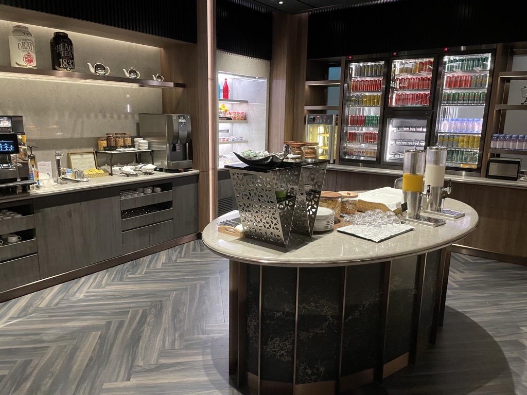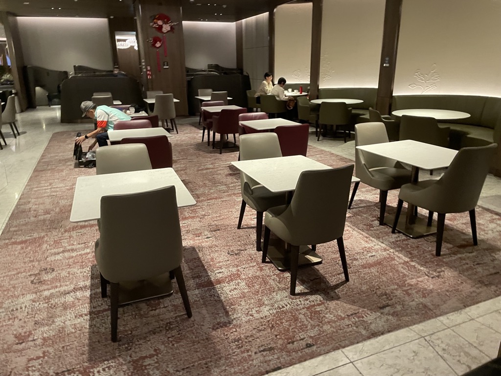 Direkt dahinter findet man den eigentlichen Lounge Bereich. Hier startet es links mit einer Restaurant Area, in der es neben dem Buffett auch klassische Tische und Stühle gibt. Dabei fällt auf, dass es nicht wie in einem Restaurant eingedeckt ist, sondern doch wie in einer Lounge mit Self Service einfach saubere Tische sind.