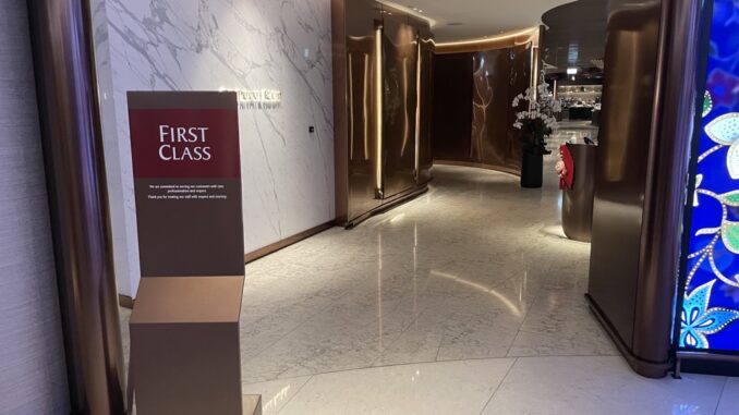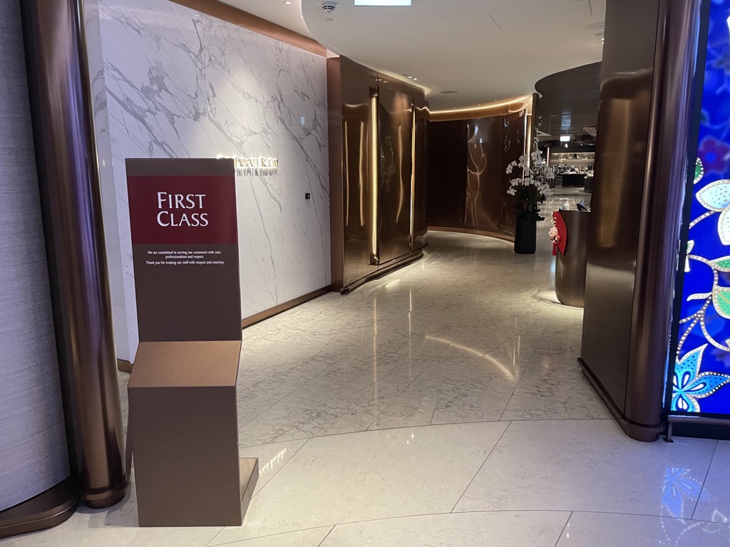 Nach einem kurzen Blick auf die Bordkarte wurde ich direkt in die First Class Lounge gebeten. Ich hatte hier etwas Bedenken, da ich schon am Morgen (nach der Ankunft in Singapur), vor meinem Abflug am Abend nach Frankfurt in die Lounge wollte, aber ohne auch nur ein Wort darüber zu verlieren, dass der Abflug in 16 Stunden ist, hat man mich in die First Class Lounge geleitet, nur mit dem kurzen Hinweis, dass mein Flug voraussichtlich aus Terminal 2 abfliegt und ich etwas Zeit für den Transfer dorthin einplanen sollte.
