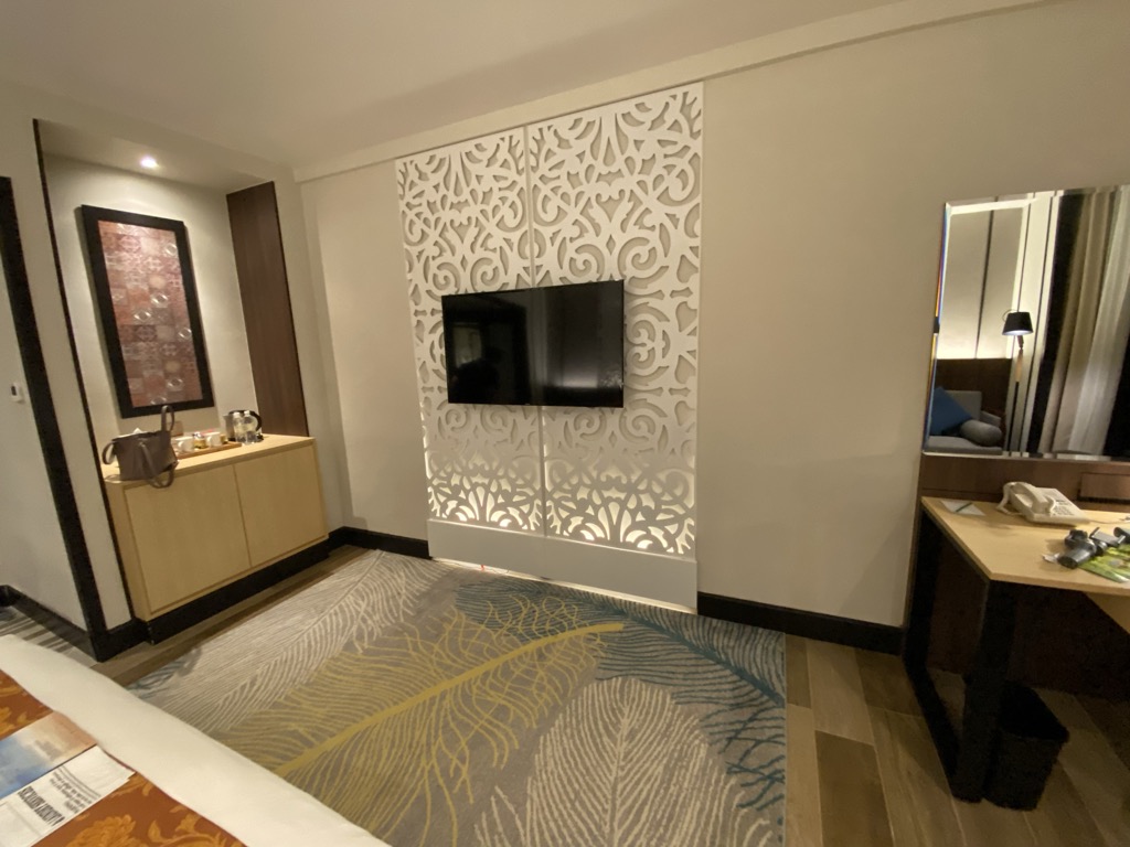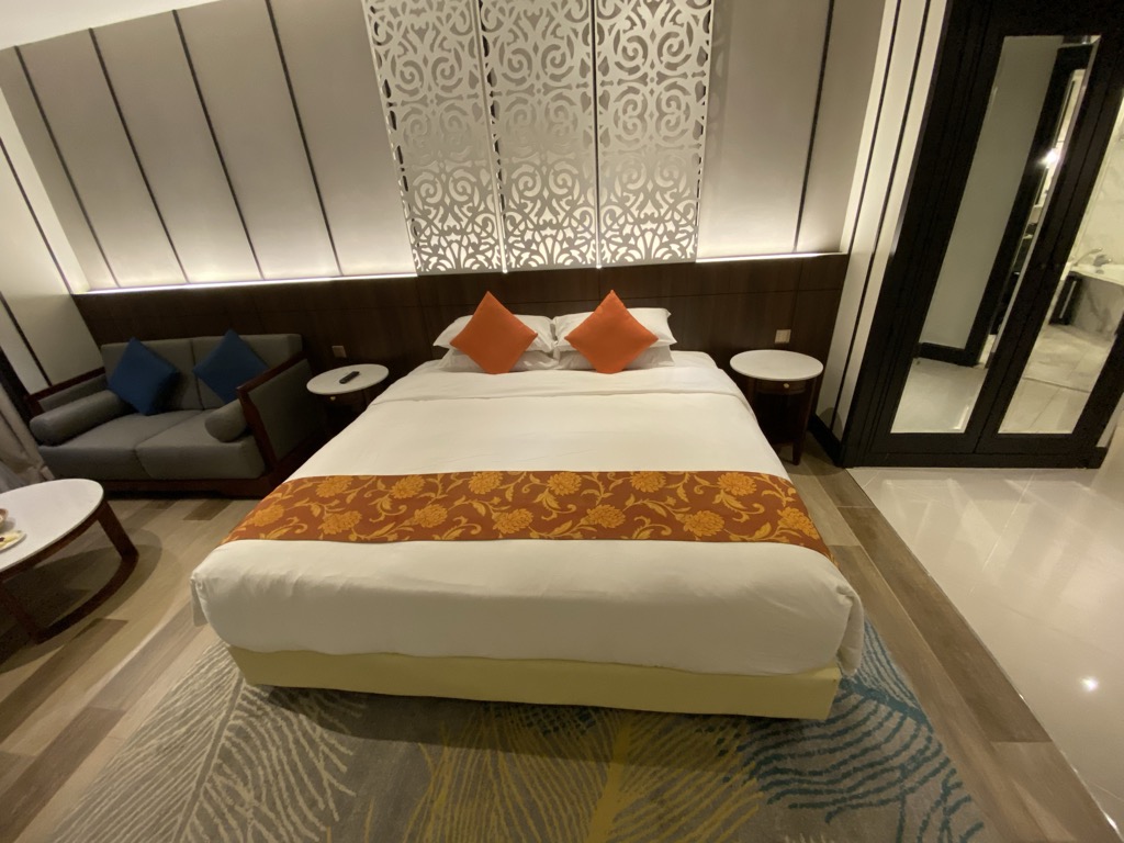 Zentrales Element des Zimmers war das großzügige Bett, welches mit einer durchgehenden Decke und mehreren Kissen ausgestattet war. Hier haben wir sehr gut geschlafen.