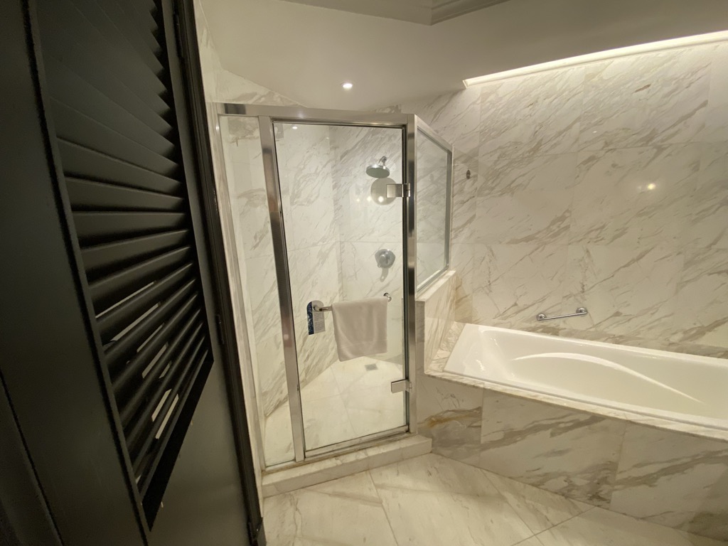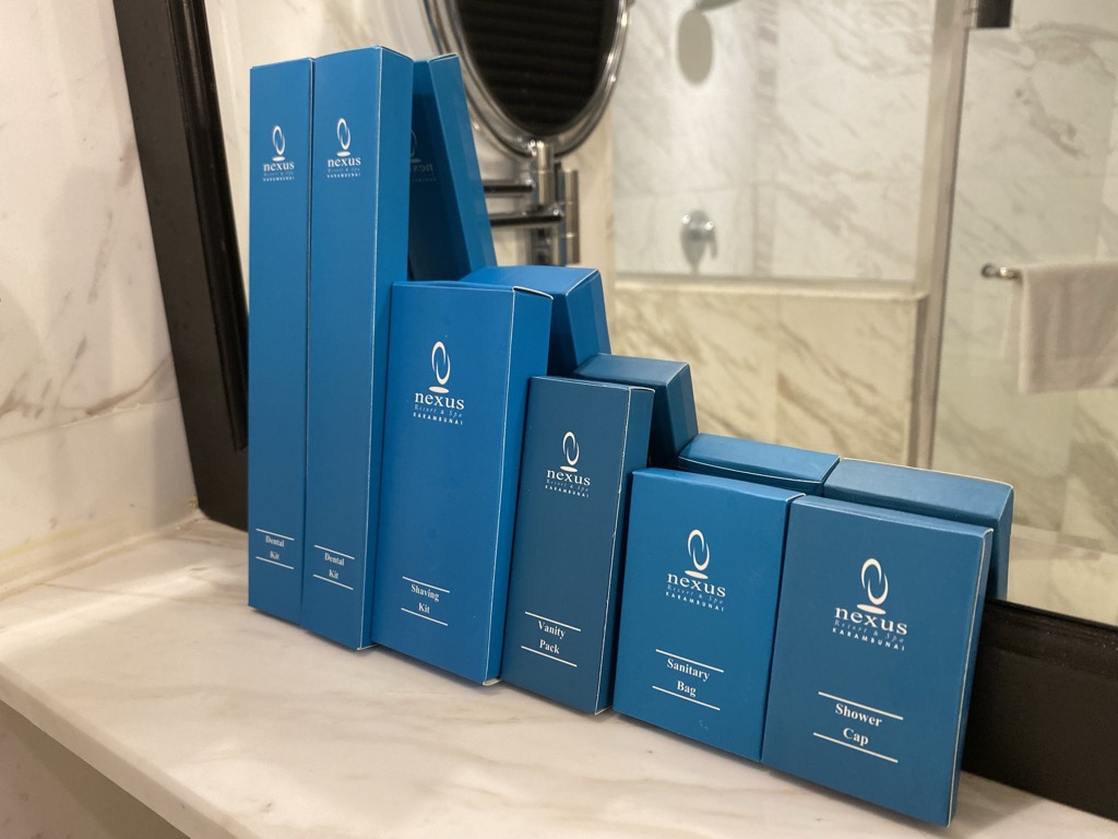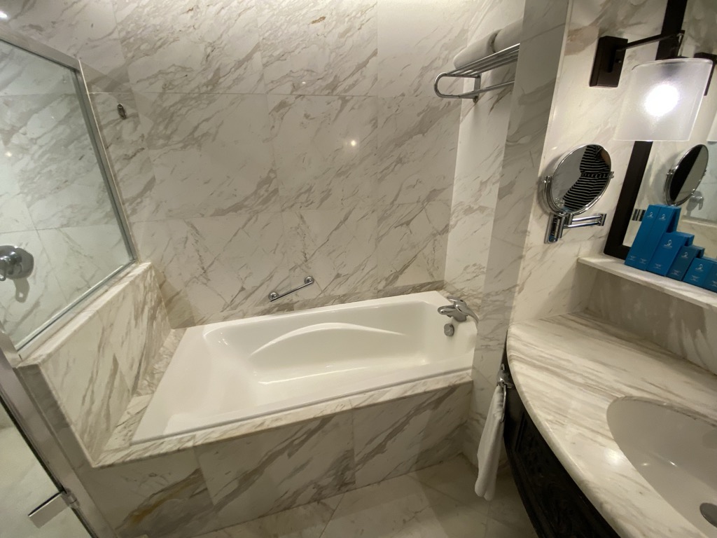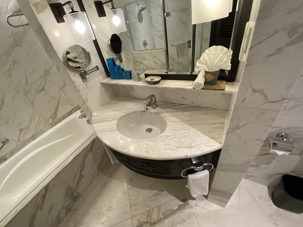 Uns wurde ein Zimmer auf der höchsten Etage zugewiesen, welches über einen Fahrstuhl erreichbar war. Direkt nach dem Betreten befand sich auf der linken Seite das Badezimmer, welches neben der Toilette mit einem Waschbecken mit viel Ablagefläche und einer Badewanne, sowie Dusche ausgestattet war. Am Waschbecken erwartete uns bereits eine vollständige Auswahl Amenities.