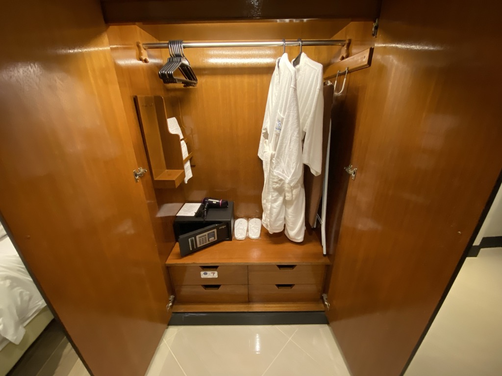 Gegenüber vom Badezimmer ist der Schrank verbaut, in welchem sich Bademäntel, Hausschuhe und ein Safe befanden.