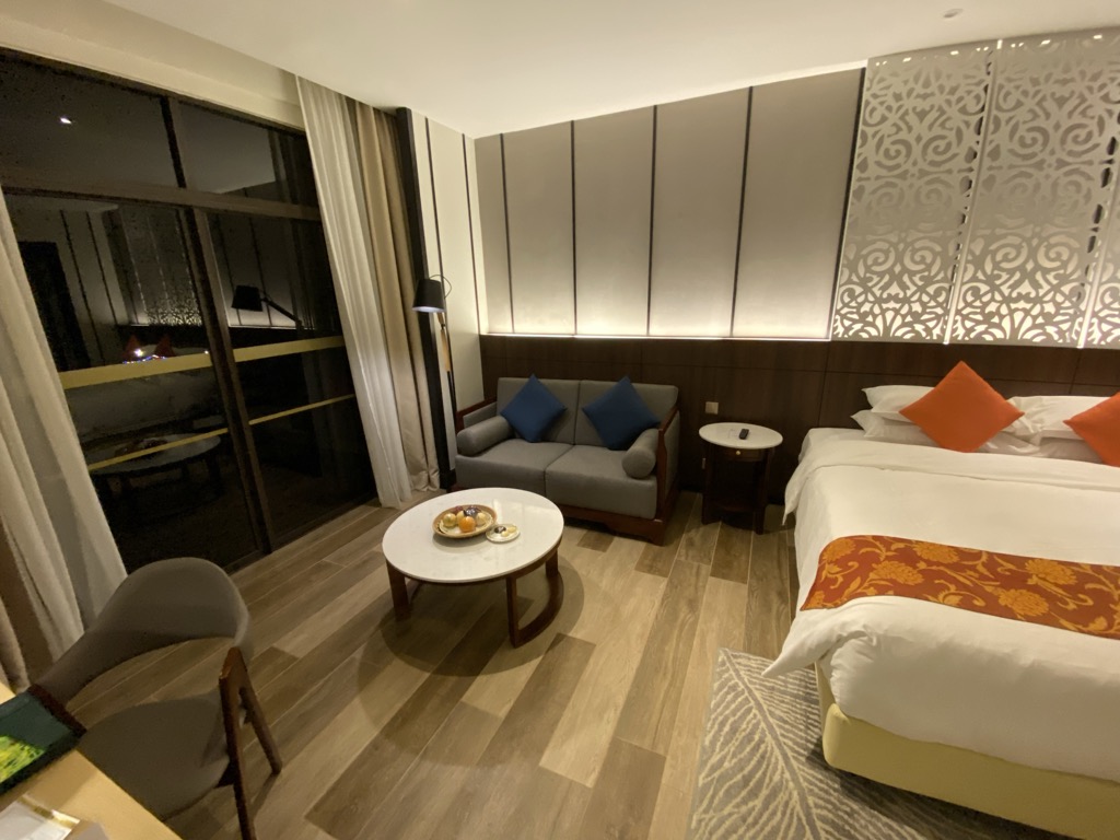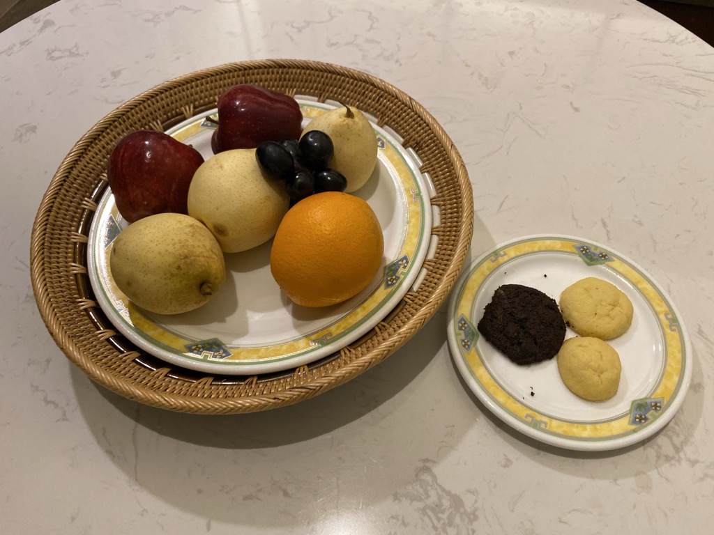 Neben einem Schreibtisch, an dem einige Steckdosen und USB Anschlüsse verbaut waren, gab es im Zimmer noch eine Kaffee- und Teestation inklusive Kühlschrank, sowie eine Sitzecke mit Couchmöbeln. Hier begrüßte und ein Obstteller – eine sehr nette Geste.