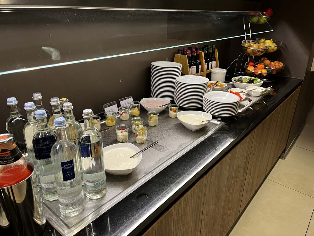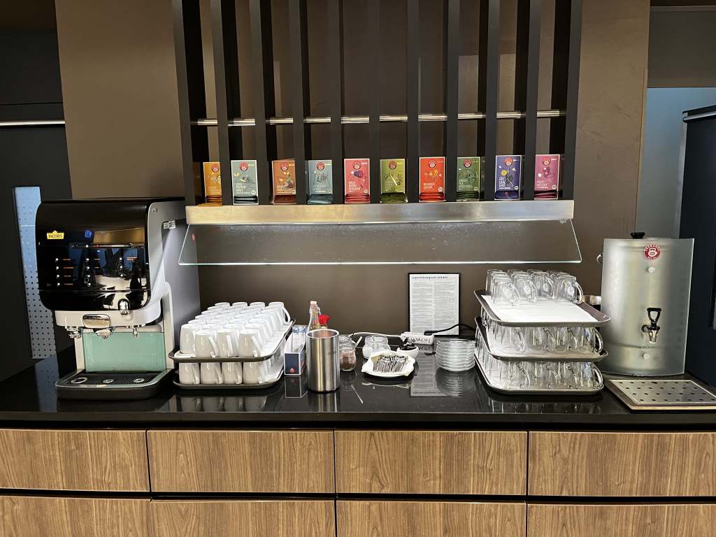 Zur Selbstversorgung mit Getränken stand ein Kaffeeautomat, diverse Teesorten und Säfte sowie Wasser bereit.