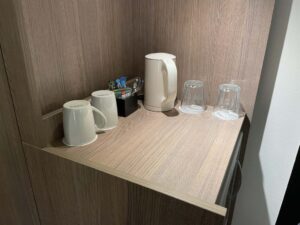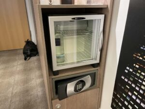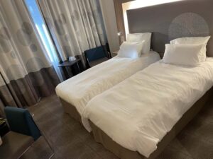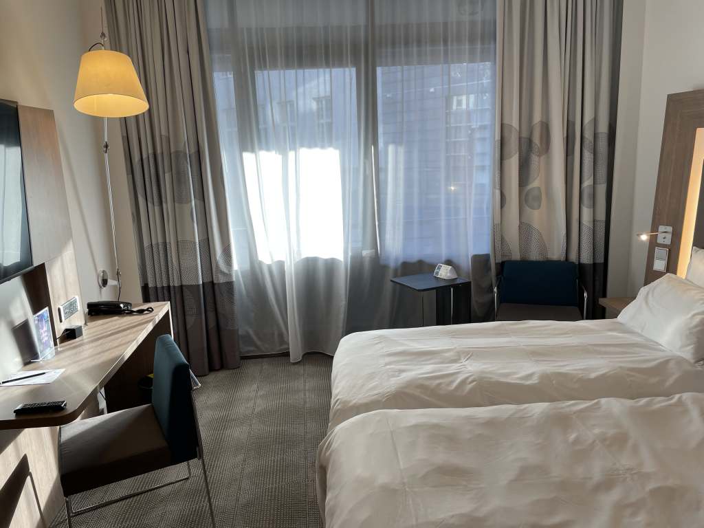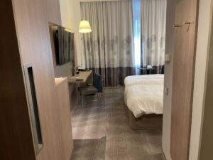 Das Zimmer hatte einen Blick auf die Einfahrt zur Tiefgarage und war mit zwei Einzelbetten ausgestattet. Auf der Längsseite des Zimmers gab es zunächst einen Gaderobenschrank, anschließend eine Kofferablage, Minibar, Safe und ein Wasserkocher mit Tee und Instant-Kaffee. Daran schloss sich ein Schreibtisch mit zusätzlichem Stuhl an, über dem ein 55 Zoll großer Smart-TV hing.