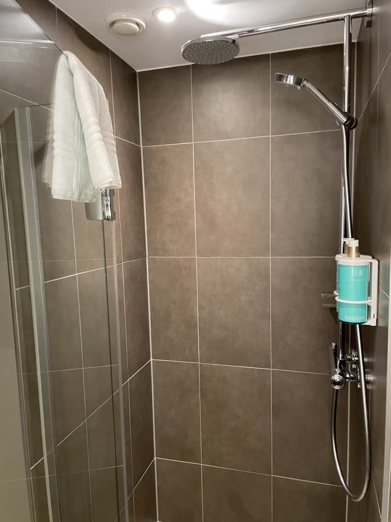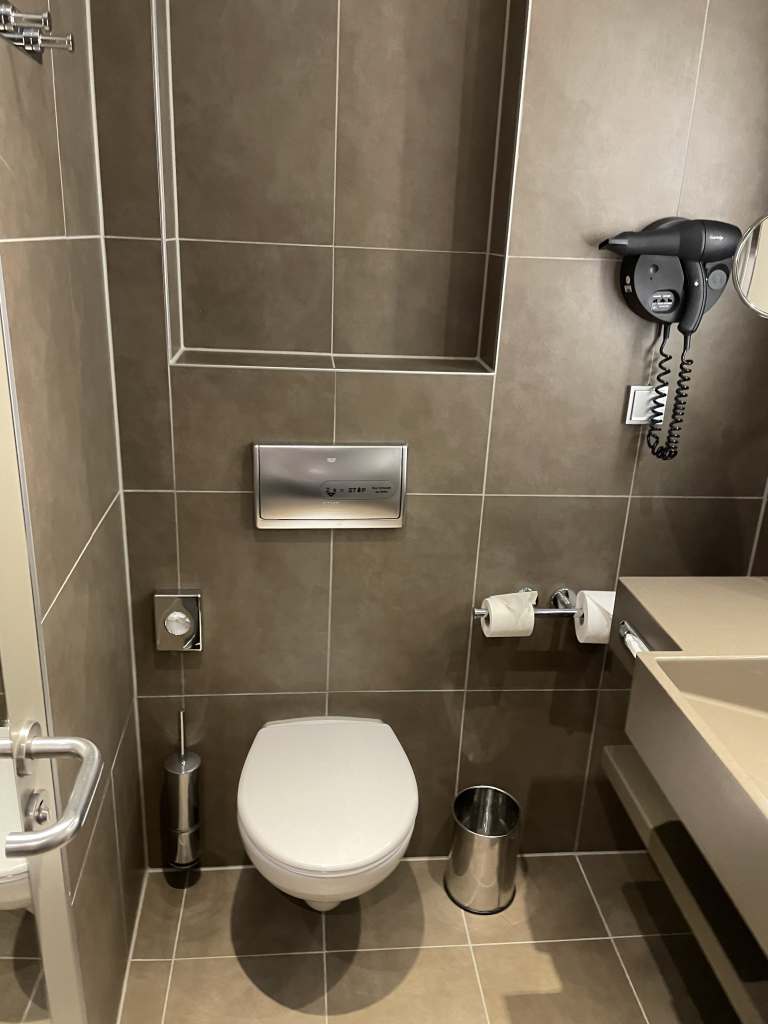 Das Bad war zwar klein, aber nicht beengend und verfügte über eine Dusche über Kopf sowie eine Handbrause. Toilette und Waschtisch mit Spiegel waren natürlich ebenfalls vorhanden. Die Pflegeprodukte stammten von Rituals. Aber neben Duschbad, Shampoo und Flüssigseife suchte man nach weiteren Amenities vergeblich.