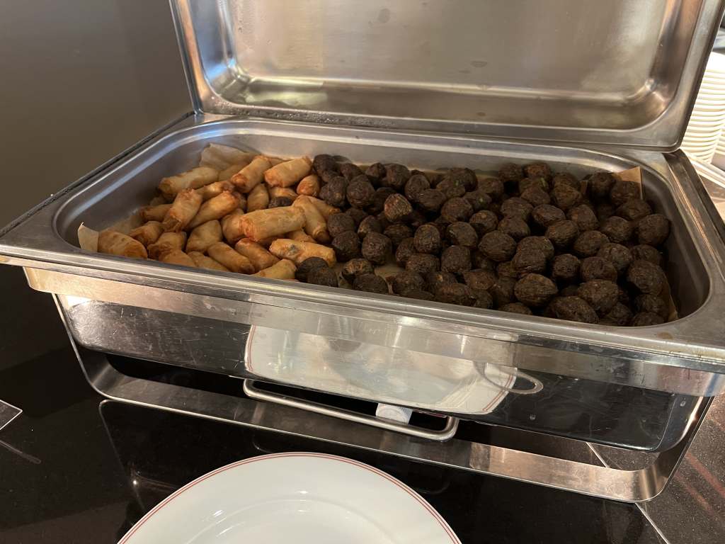 Auch am Büffet gab es warme Speisen, wie Fleischbällchen, Frühlingsrollen, Würstchen, Rührei, Speck, Tomaten und Kartoffeln. Für das gesündere Frühstück gab es Joghurts, Müsli, Salat und Obst.