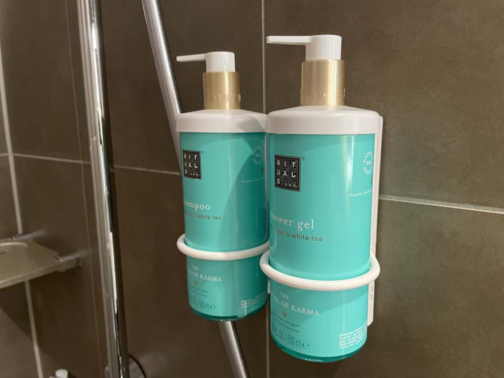 Das Bad war zwar klein, aber nicht beengend und verfügte über eine Dusche über Kopf sowie eine Handbrause. Toilette und Waschtisch mit Spiegel waren natürlich ebenfalls vorhanden. Die Pflegeprodukte stammten von Rituals. Aber neben Duschbad, Shampoo und Flüssigseife suchte man nach weiteren Amenities vergeblich.