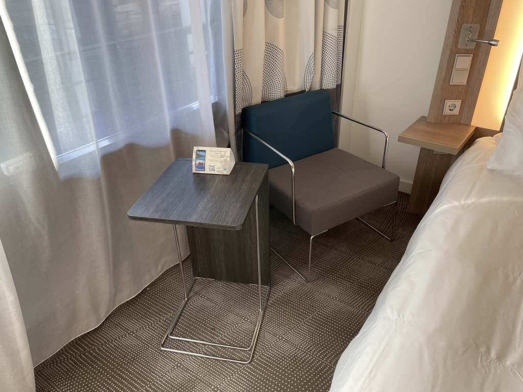 Das Zimmer hatte einen Blick auf die Einfahrt zur Tiefgarage und war mit zwei Einzelbetten ausgestattet. Auf der Längsseite des Zimmers gab es zunächst einen Gaderobenschrank, anschließend eine Kofferablage, Minibar, Safe und ein Wasserkocher mit Tee und Instant-Kaffee. Daran schloss sich ein Schreibtisch mit zusätzlichem Stuhl an, über dem ein 55 Zoll großer Smart-TV hing.