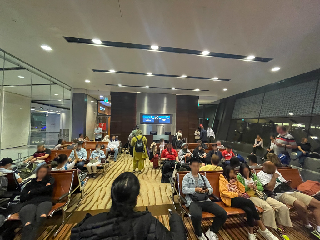 Der Flughafen Muskat bietet inzwischen die Möglichkeit, die allermeisten Flüge direkt vom Terminal aus zu boarden. Bevor man allerdings an Bord der Flugzeuge geht, versammelt man sich in einem abgetrennten Gatebereich. Bei Betreten des Bereichs erfolgen noch einmal eine Pass und Bordkartenkontrolle. Der Beginn des Boardings wurde dann nicht angesagt, nur die Türen in Richtung Flugzeug wurden geöffnet.