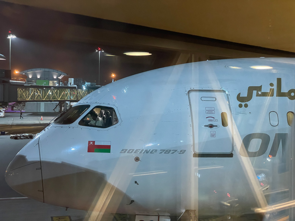 Oman Air bietet viele Verbindungen über Muskat an, die aus einer Tag-/Nachtflugkombination bestehen. Dieser Flug führte mich in der Business Class von Muskat nach Bangkok. Ausgeführt wurde er in einer Boeing 787-9 und zwar in der Variante ohne First Class. Nachdem mein erster Flug mit Oman Air auf dieser Reise so angenehm war, hatte ich entsprechend hohe Erwartungen, zumal der Flug am Hub von Oman Air in Muscat startete.