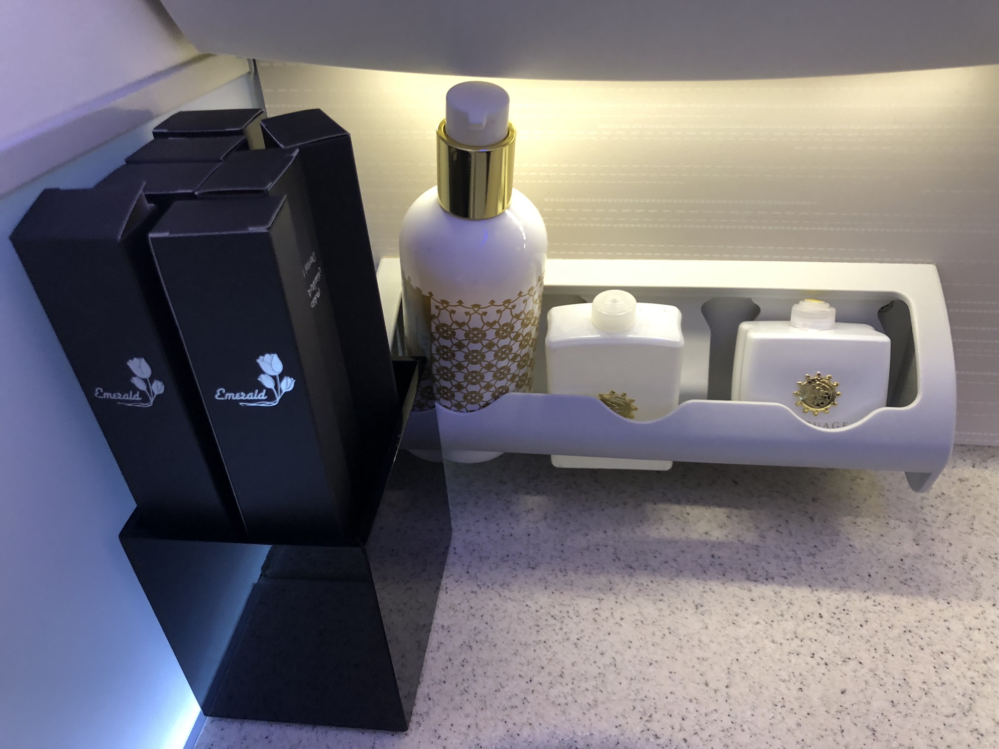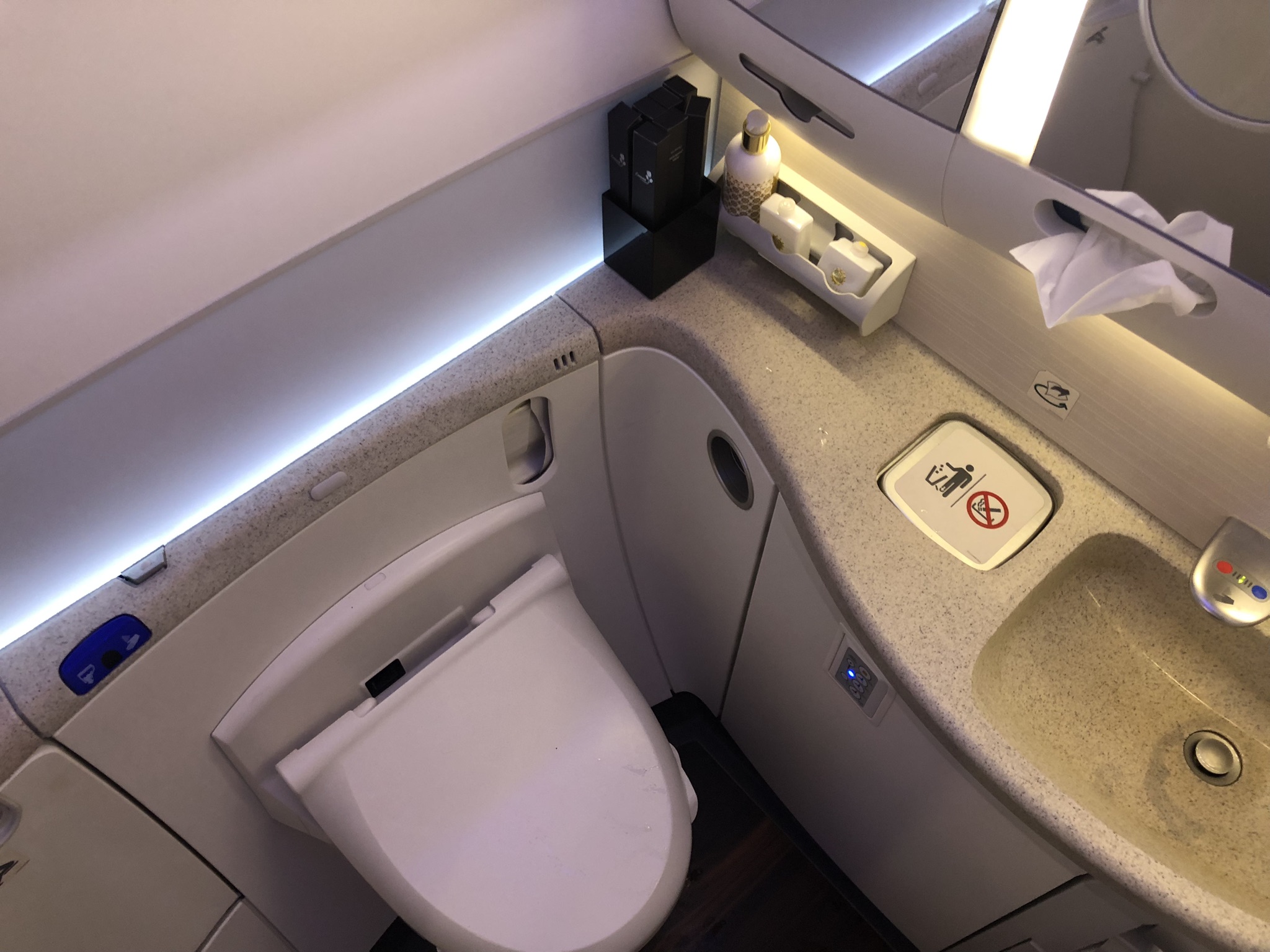 Decke, Kissen und eine Matratze waren auch schon bereit, letztere hatte ich schon vor dem Start über den Sitz gezogen und bis zur Landung benutzt. Zusätzliche Pflegeprodukte und Amenities sind in den Waschräumen zu finden.