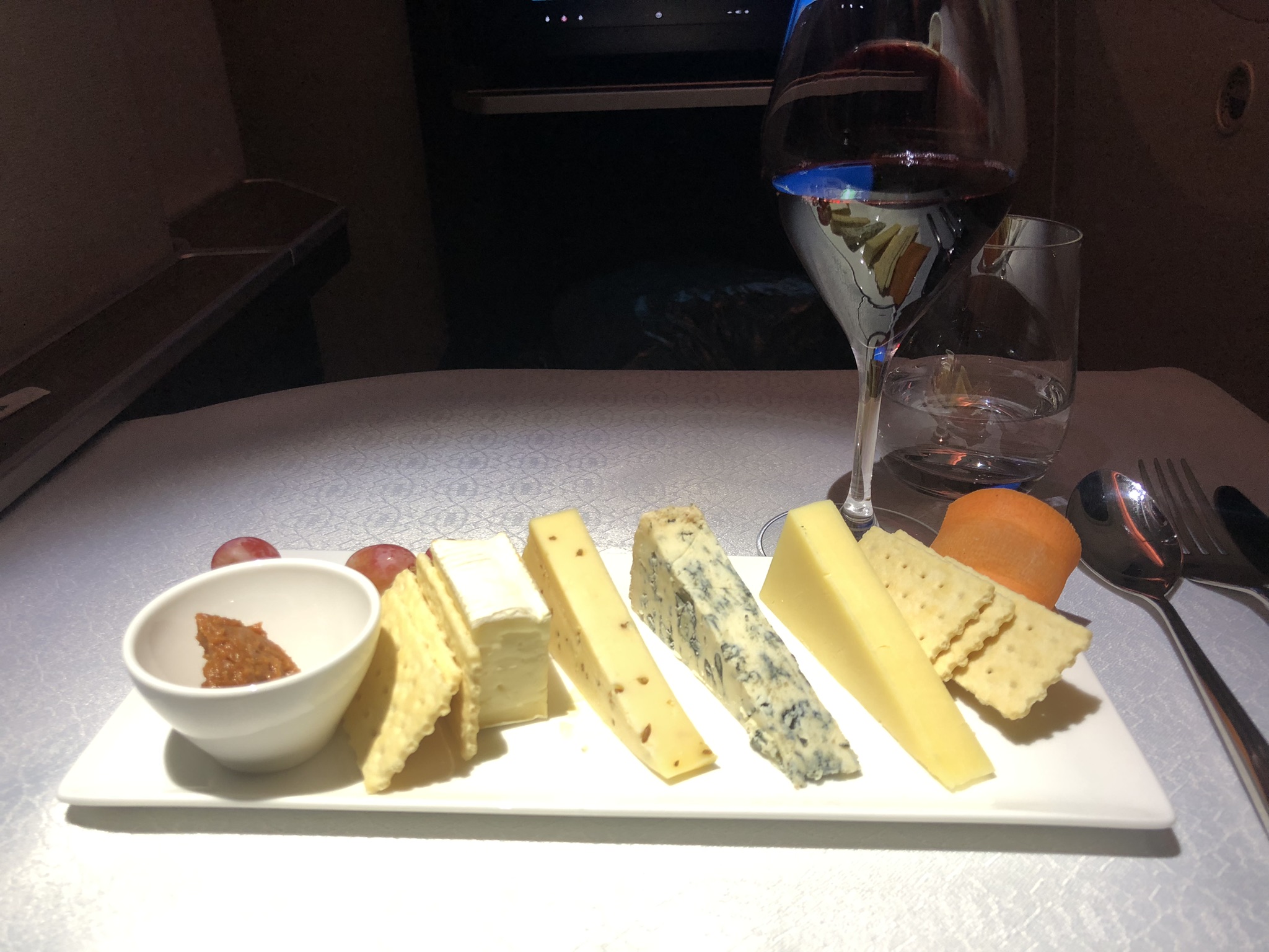 Ich bestellte noch die Käseplatte zusammen mit einem Glas Rotwein, das Cuvée von Penfolds fand ich persönlich überragend. An Bord wurden übrigens die gleichen Weine wie in der Lounge serviert.