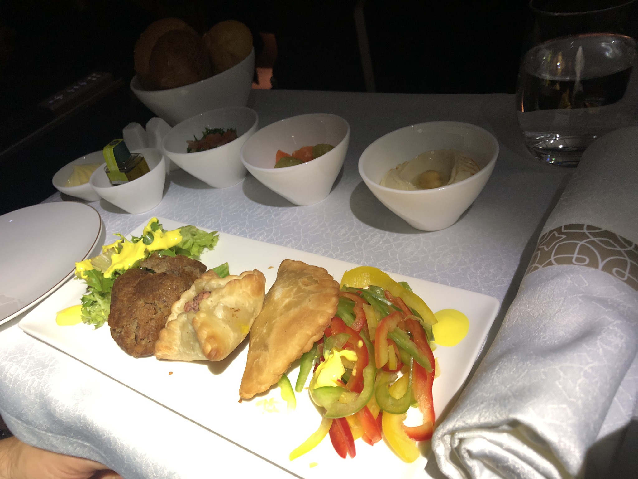 Der Flug war mit leicht unter 8 Stunden nicht besonders lange, nach dem ersten kurzen Service blieben nur gut drei Stunden Zeit zum Schlafen bis wir schon geweckt wurden. Draußen wurde es hell, das Servicekonzept von Oman sah Mittagessen vor. Zunächst wurden Vorspeisen gebracht.