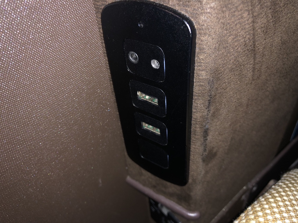 Am Sitz gibt es Steckdose, USB Anschlüsse und reichlich Stauraum, die Kopfhörer lagen in einem Etui bereit.