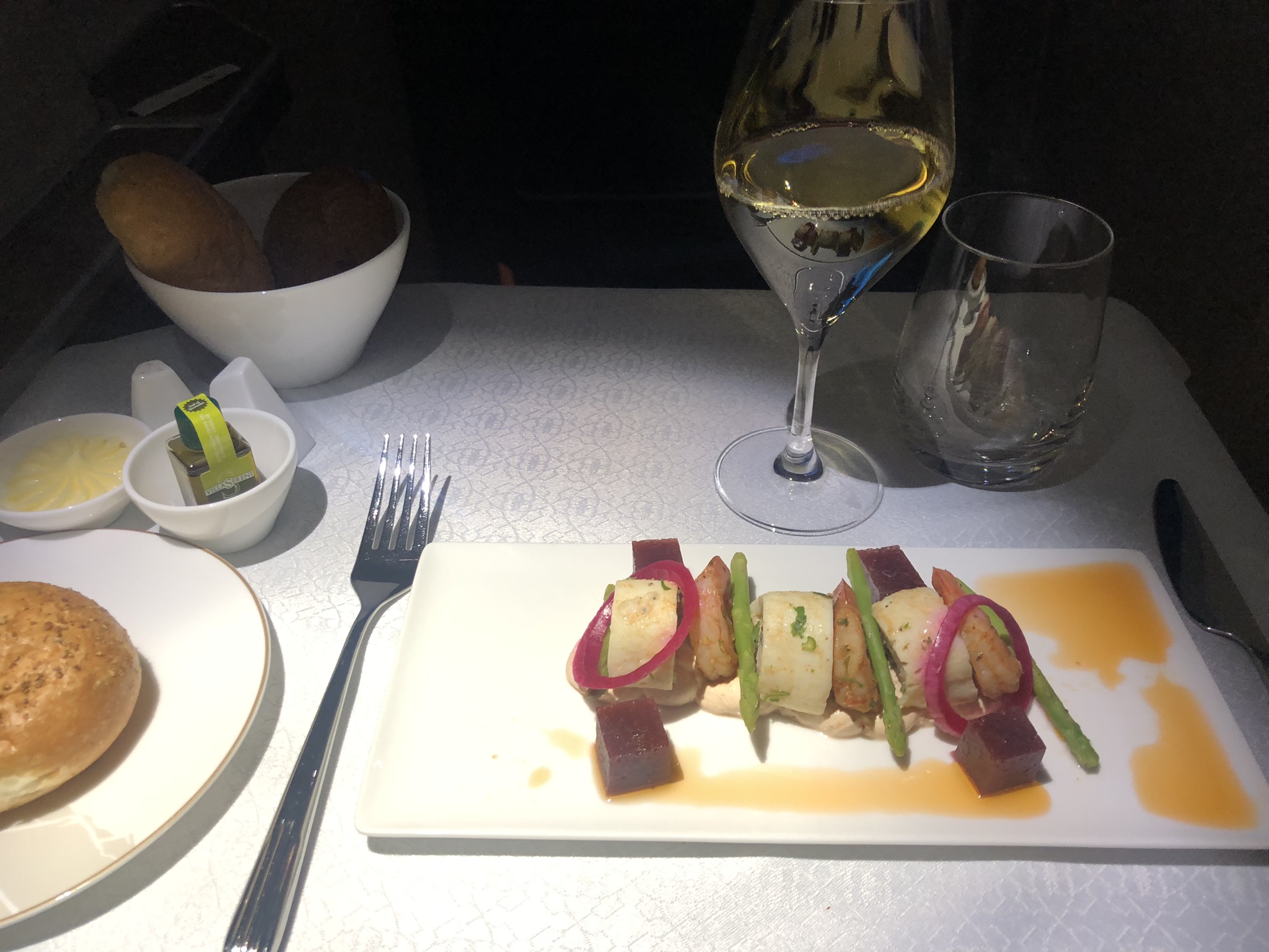 Pyjama, Menü-„Buch“, Gläser und Geschirr machten einen hochwertigen Eindruck, die Auswahl beim Service ist reichhaltig, die Flugbegleiter arbeiteten effizient und waren ziemlich aufmerksam. Lediglich der Purser war nur kurz nach dem Start zu sehen und verbrachte den restlichen Flug – für Besucher der Galley sichtbar – schlafend.