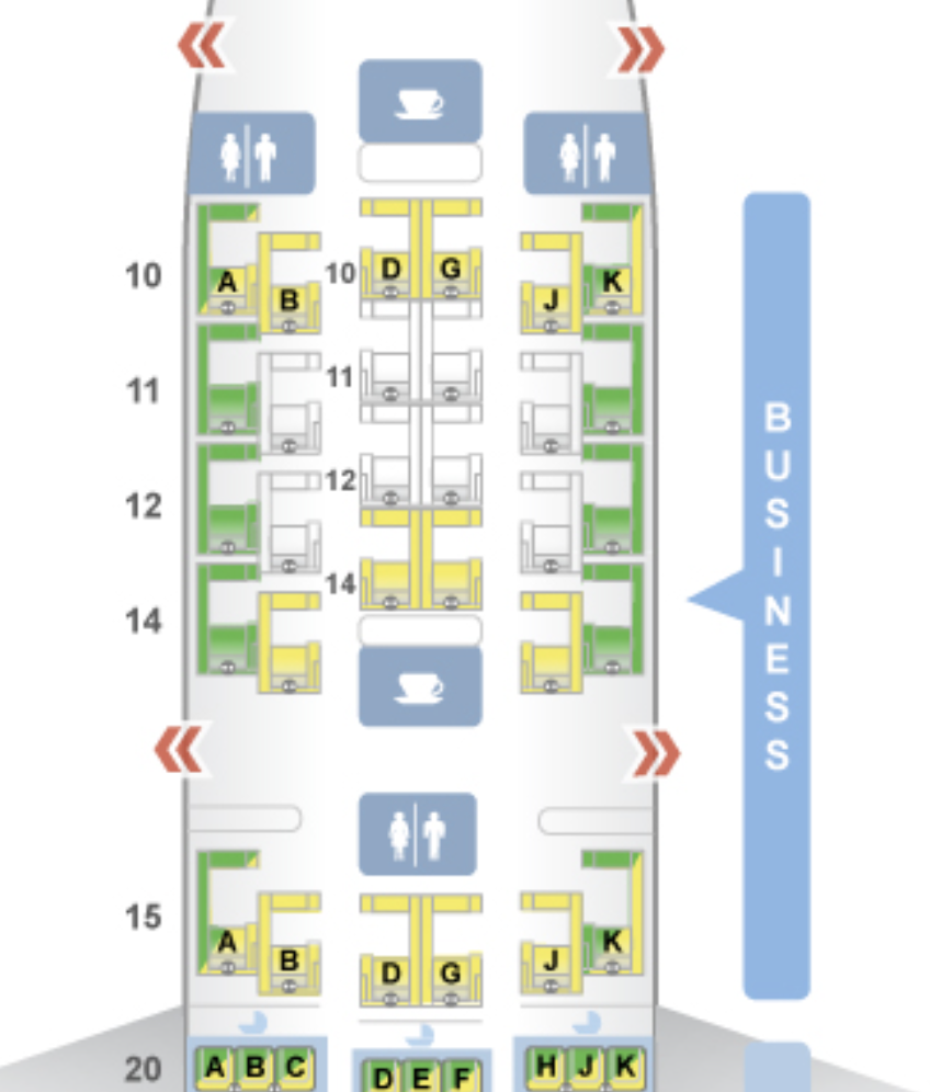 Die Sitze sind zwar in einer 2-2-2 Anordnung installiert, bieten dennoch jedem Gast direkten Zugang zum Kabinengang. Die Sitze A und B sowie J und K an den Fenstern sind etwas versetzt angeordnet, dadurch entsteht ein – wenn auch enger – Zugang zum jeweiligen Gang.