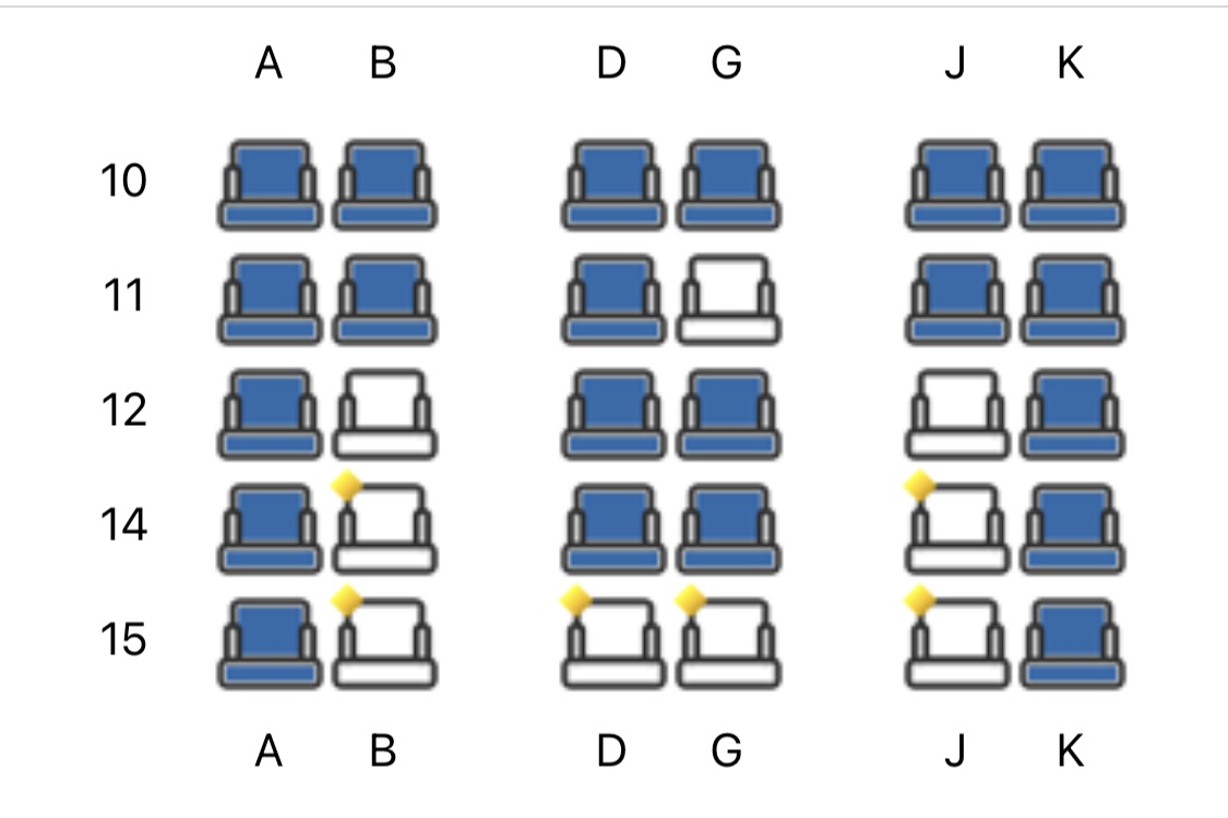 Alle Sitze sind also sowohl für Alleinreisende als auch für z.B. Paare geeignet, die größte Privatsphäre hat man auf den A und K Plätzen.