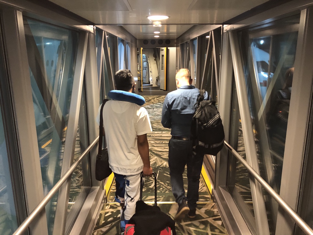 Am Ende der Fluggastbrücke ging ein Finger ab, diesen durften nur Gäste der Business Class betreten. Alle anderen mussten über das Vorfeld und Treppen zur anderen Eingangstür.