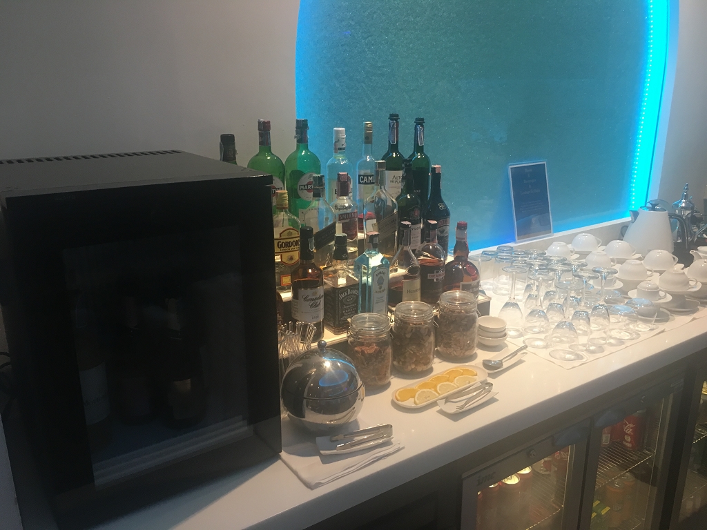 In dem dunkleren Raum befinden sich Kühlschränke mit den Getränken (Softdrinks, Säfte, Kakao und Bier). Zudem gibt es eine Self-Service Cocktail/Longdrink Bar mit einer reichhaltigen Auswahl.