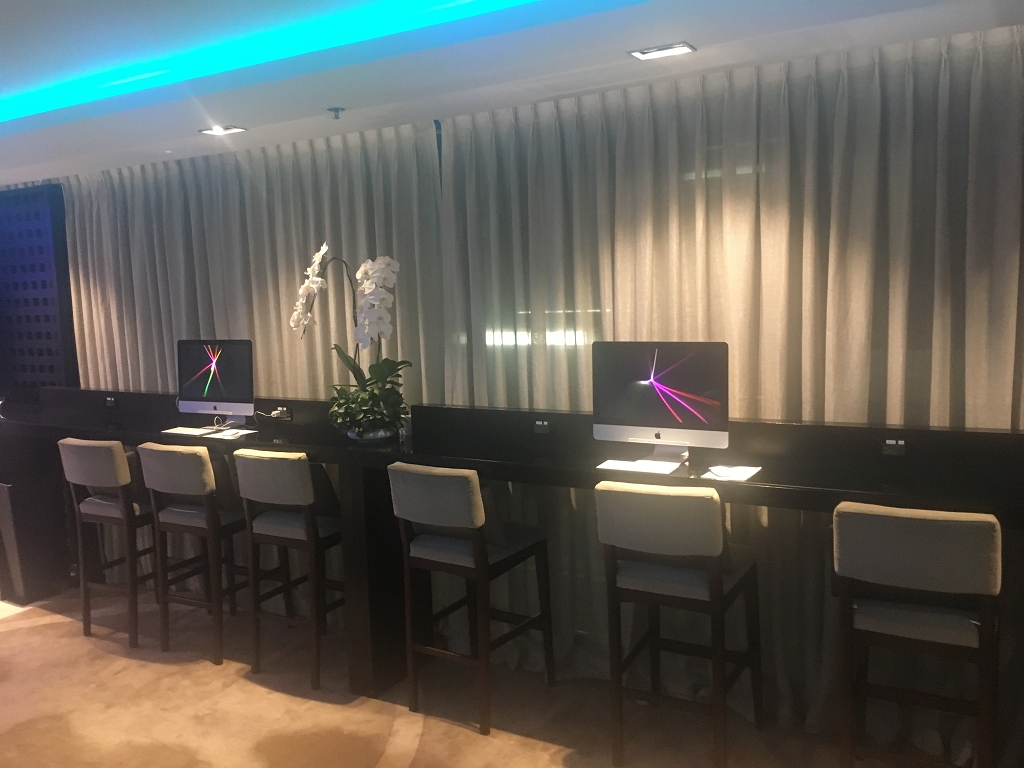 An der hinteren Wand entlang befindet sich ein abwechslungsreiches Buffet. Außerdem gibt es noch zwei Arbeitsplätze mit Macs. Hier ist jedoch zu beachten, dass die Bildschirme zum einen groß und zum anderen dem Raum zugewandt sind, sodass man hier nicht vertraulich surfen/arbeiten kann. Ansonsten befinden sich weitere Sitzplätze und Tische in dem Raum.