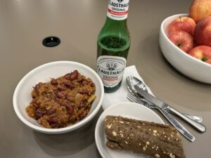 Es gibt Salate, Sandwiches, Obst, Kuchen, Brot, Aufstrich, Käse und Knabberzeug, als warme Speise gab es Chili con Carne.