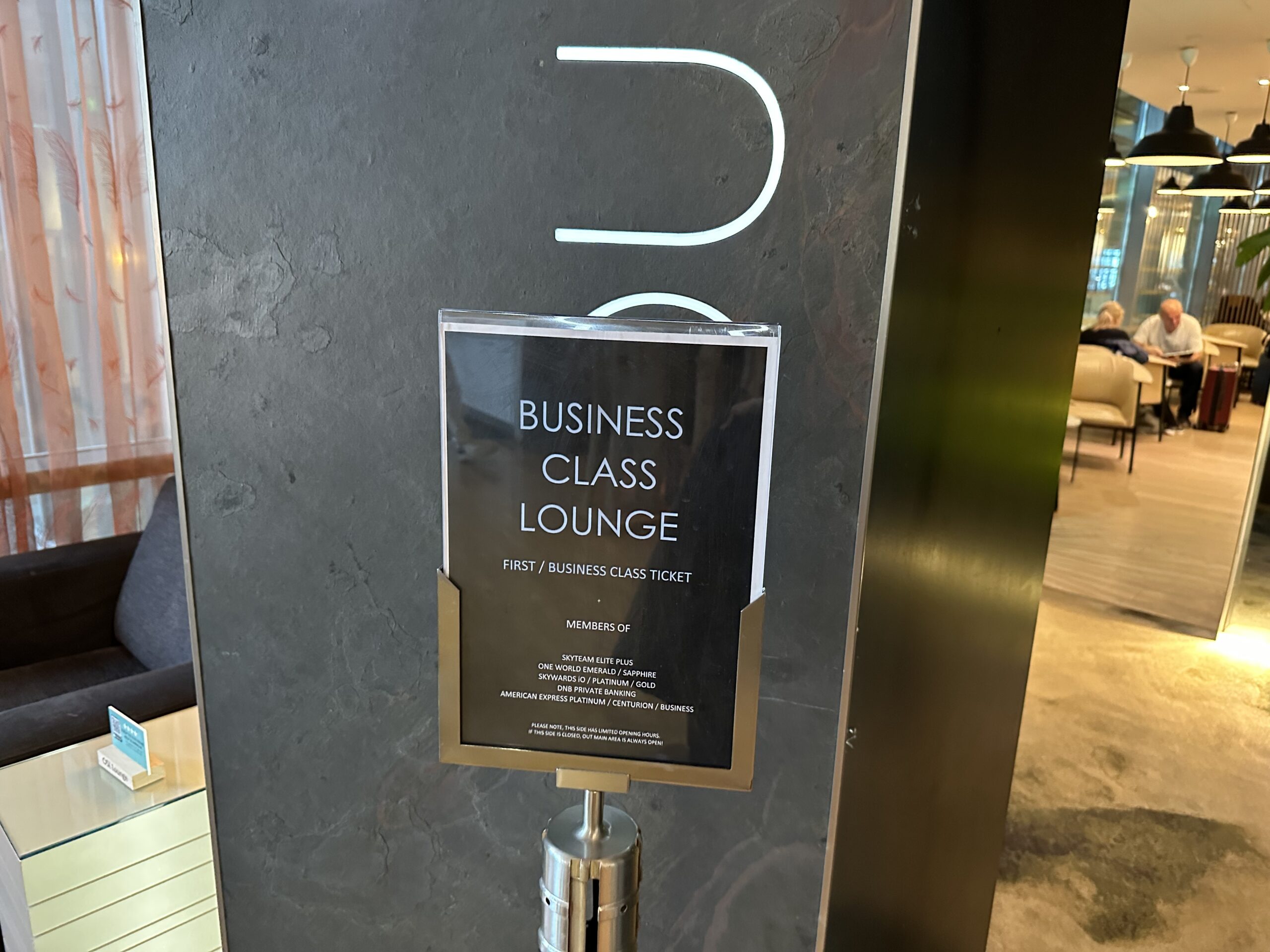 Alle nicht mit SAS verpartnerten Airlines schicken die Premium-Kunden in die OSL Lounge, dort dürfen Passagiere der SkyTeam und oneworld Gesellschaften und Partner wie Emirates rein. Neben der Liste mit allen Airlines, Klassen und Statusstufen steht noch ein Schild mit einigen Kreditkarten- unter anderem ist dort auch eine American Express abgebildet.