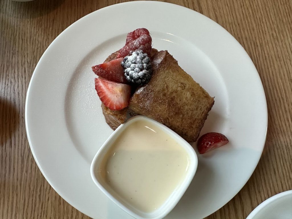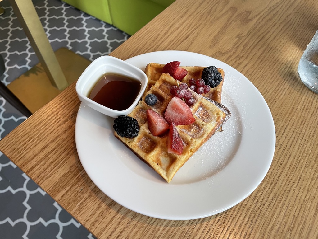 Kaffee und Tee wird von den Kellnern am Platz serviert und aus einer kleinen Karte kann man sich verschiedene Eierspeisen und auch Waffeln, Pancakes oder French Toast bestellen, welche dann frisch zubereitet an den Platz gebracht werden. Alles was wir bestellt haben war auch wirklich gut, auch wenn es beim Service manchmal kleine Kommunikationsprobleme gab und z.B. anstelle von Vanille Soße Ahornsirup gebracht wurde, was aber schnell behoben werden konnte.