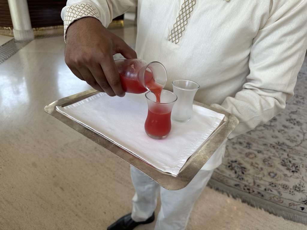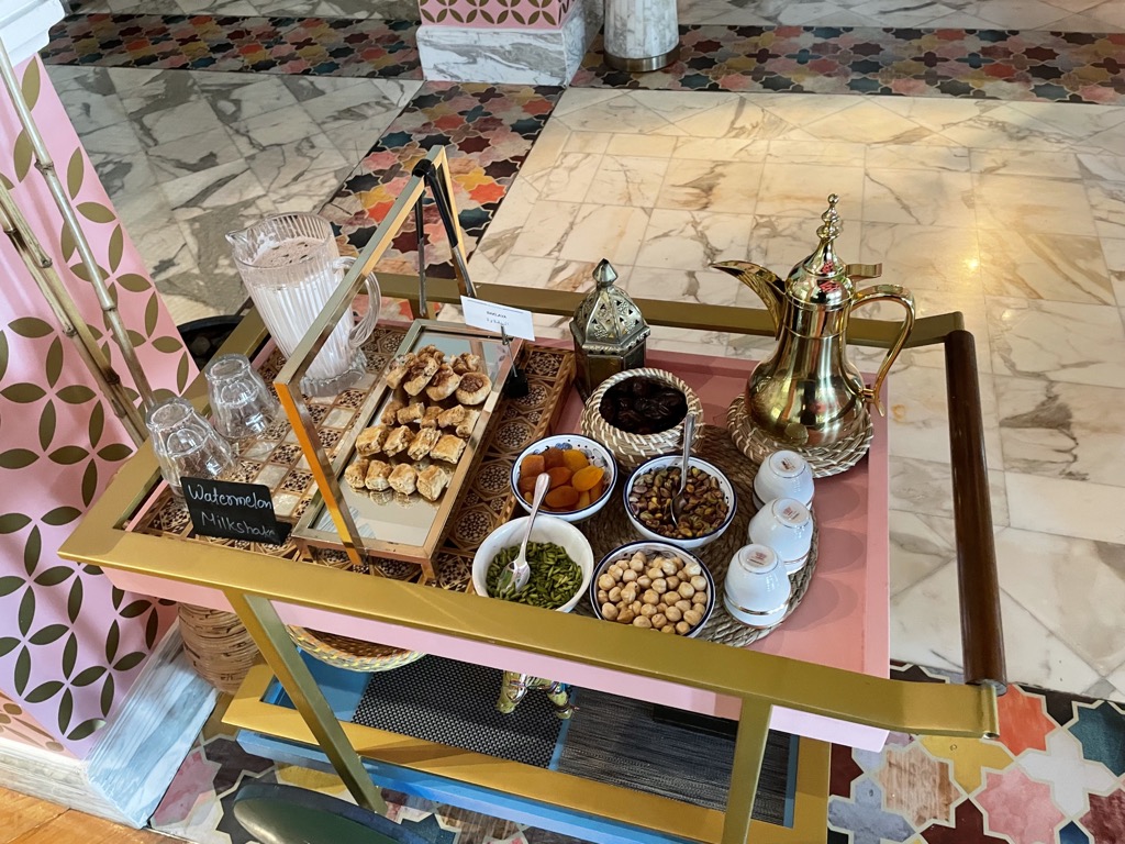 Direkt nachdem wir beim Hotel vorgefahren sind, wurden unsere Koffer vom Bell Boy aus dem Auto geladen und der Valet Service (der für Hotelgäste kostenlos ist) hat unser Auto entgegen genommen und für uns geparkt. Wir haben die wunderschöne, im arabischen Stiel gestaltete, kleine Lobby betreten und wurden mit einem kleinen Welcome Drink begrüßt, als wir mit den Check-In Formalitäten begonnen haben.