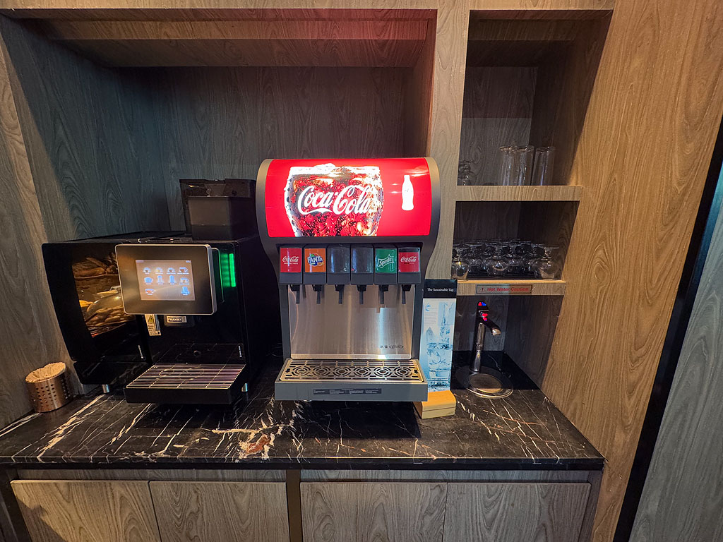 An einem Vollautomaten könnt Ihr Heißgetränke ziehen, daneben schenkt Euch ein Automat Cola, Fanta und Sprite aus. Direkt daneben versteckt sich ein Hahn, an dem Ihr heißes oder kaltes Wasser (auch mit Kohlensäure) zapfen könnt. Auffällig ist, dass keine Getränke in Flaschen oder Dosen angeboten werden. Alkoholische Getränke sind ebenfalls nicht zu finden.