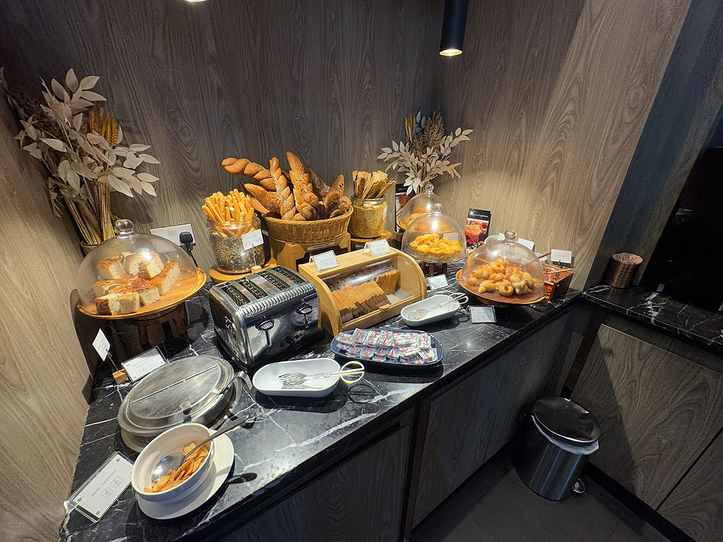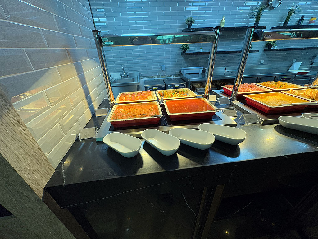 Links am Buffet beginnt es mit Salat und Joghurt. Es folgt eine eklektische Auswahl an warmen Speisen (indisch, arabisch, nordamerikanisch). Ein paar Schritte weiter gab es infrarotlampengewärmte Teilchen und Croissants. An der nächsten Station könnt Ihr aufpreispflichtig das Live-Cooking in Anspruch nehmen – ein Koch bereitet Euch dann gerne ein Omelette o.ä. zu.