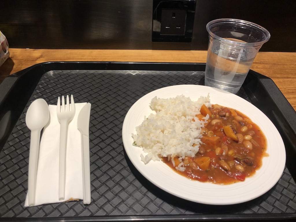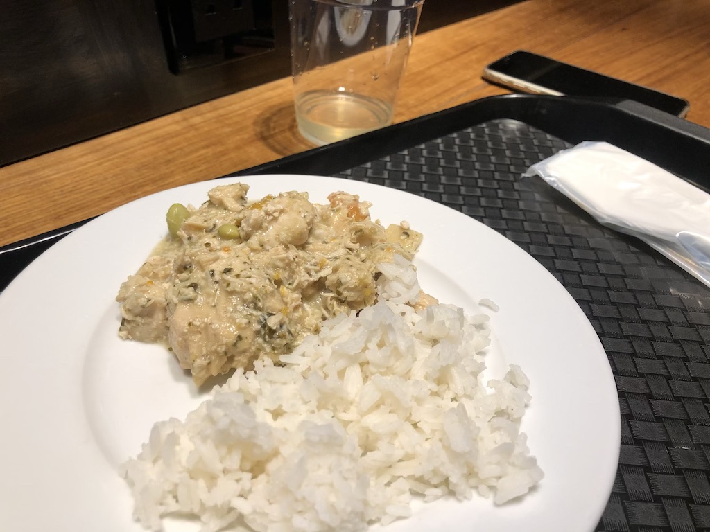 Insgesamt standen vier warme Gerichte zur Auswahl, darunter grünes Curry und auch eine Suppe. Das Essen wird auf Porzellantellern angerichtet, Besteck und Gläser gab es wiederum nur aus Plastik. Hier würde ich zu gerne wissen warum das so praktiziert wird, eine sinnvolle Erklärung erschließt sich hier nicht.
