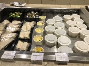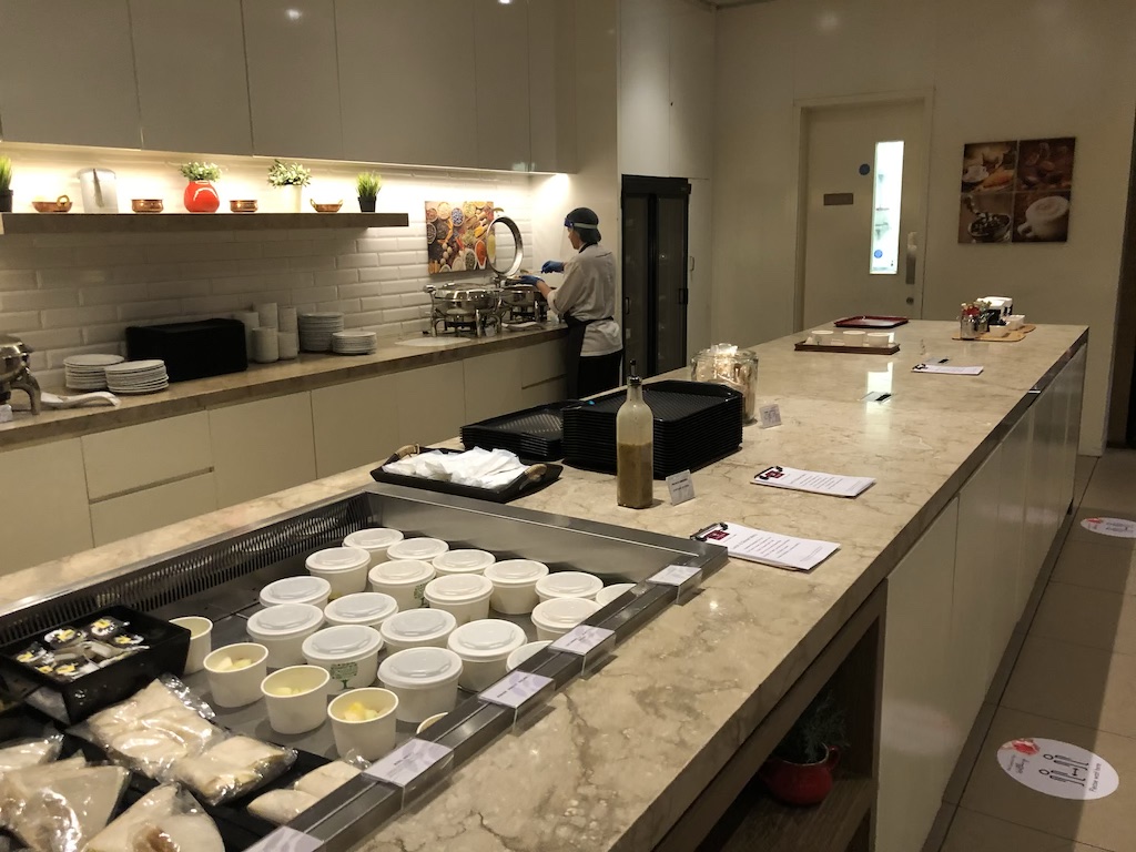 Am Buffet kann man sich an portionierten und abgepackten Dingen wie z.B. Sandwiches und Salat selbst bedienen, andere Gerichte werden vom Personal angerichtet.