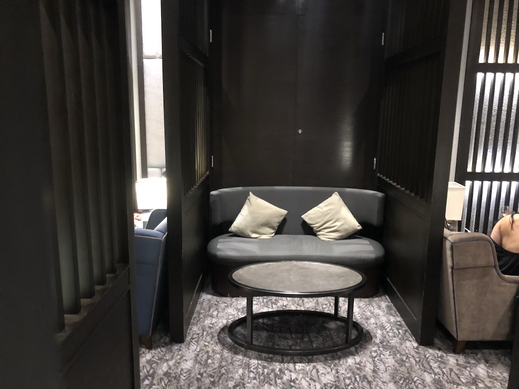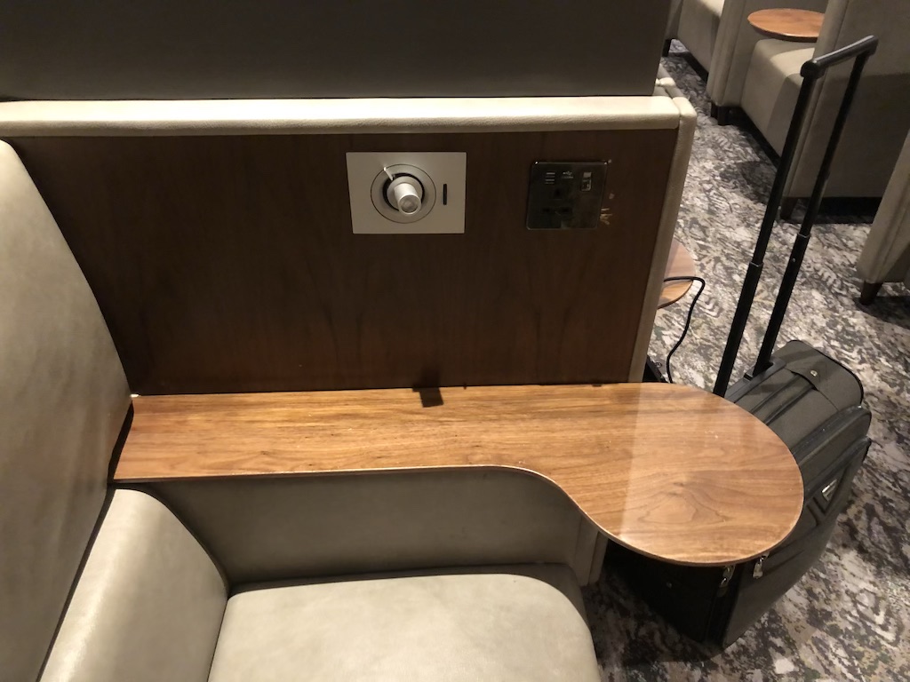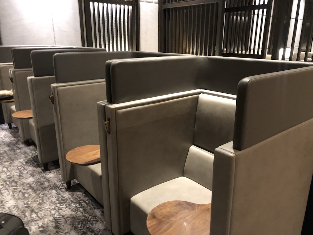 Um ungestört Arbeiten zu können, gibt es abgetrennte breite Sessel mit Stromanschluss, Leselampe und einem etwas klein geratenen Tisch. Dieser ist dennoch ausreichend für den Laptop und ein Getränk.