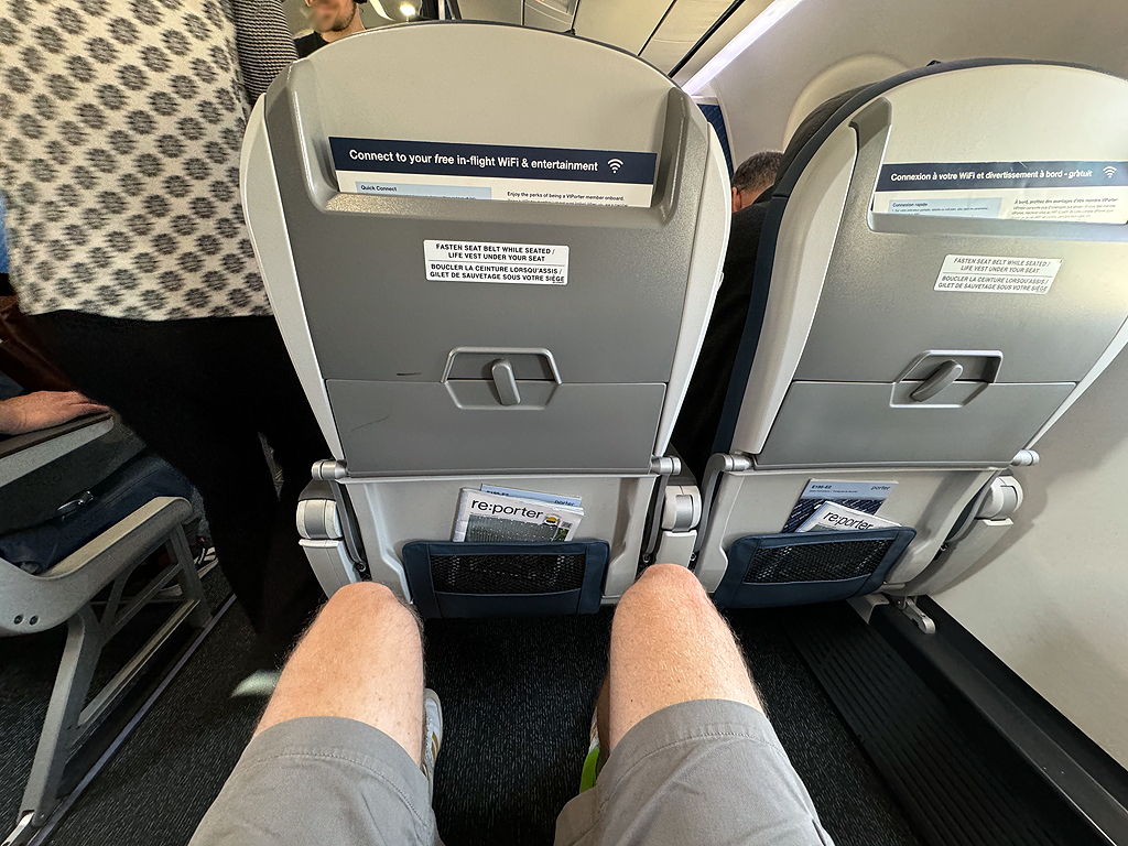 Die Kabine hat durchgehend eine 2-2 Konfiguration. Die ersten vier Reihen bilden die Porter Reserve Sektion, in der der Sitzabstand bei ca. 91cm liegt. Die Sitzreihen 5, 6, 7 sowie die Notausgangsreihen 13 und 14 gelten als Porter Stretch Sitze. Vorne gibt es 86cm Sitzabstand, am Notausgang sind es 89cm Diese Sitze kann man gegen Aufpreis reservieren bzw. sind sie preislich in den flexiblen Porter Basic Tarifen enthalten. In den übrigen Reihen beträgt der Sitzabstand nur 76cm.