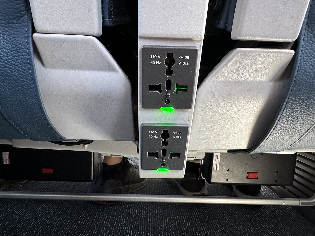 Pro Reihe gibt es zwei Steckdosen, so dass die Stromversorgung aller Passagiere an Bord sichergestellt ist. Das Klapptischchen lässt sich der Länge nach halbieren, zum Aufstehen würde ich es dennoch lieber komplett einklappen.