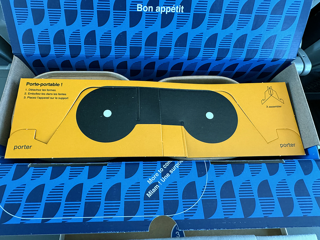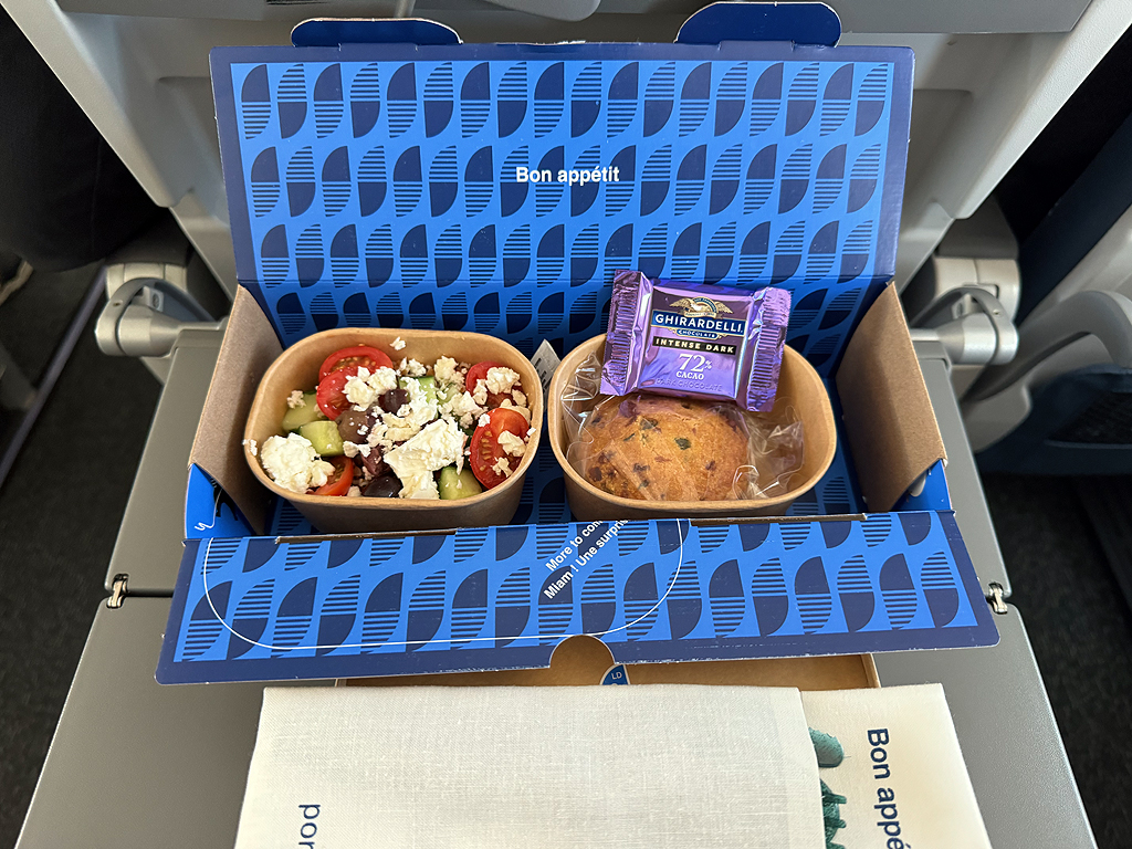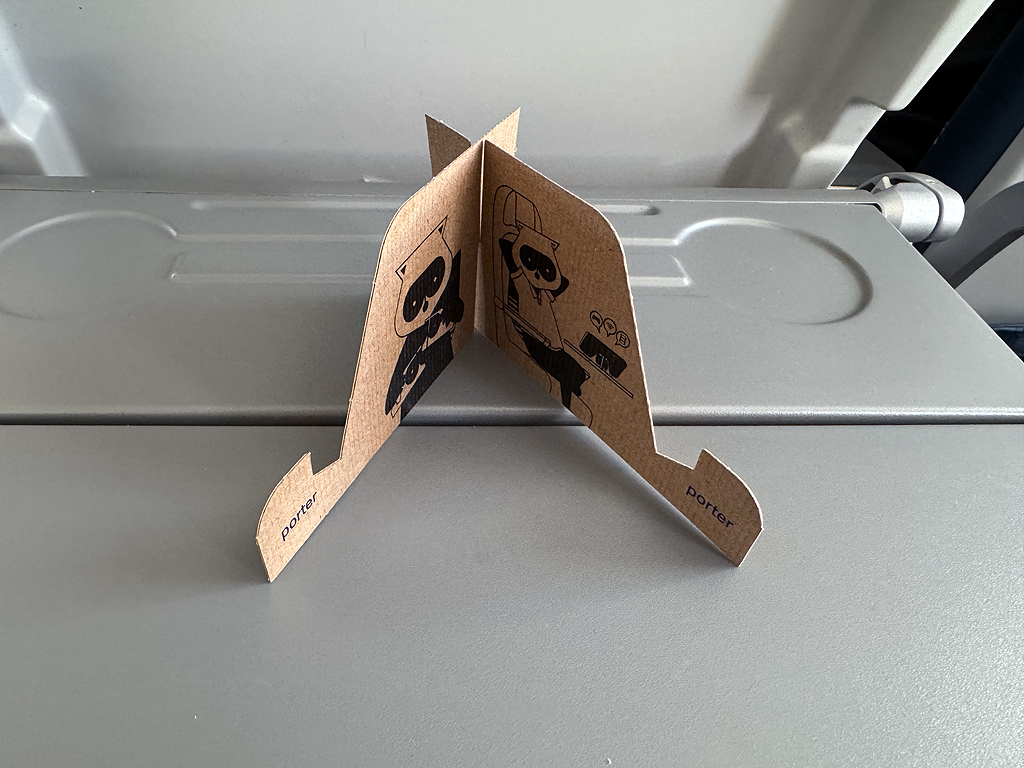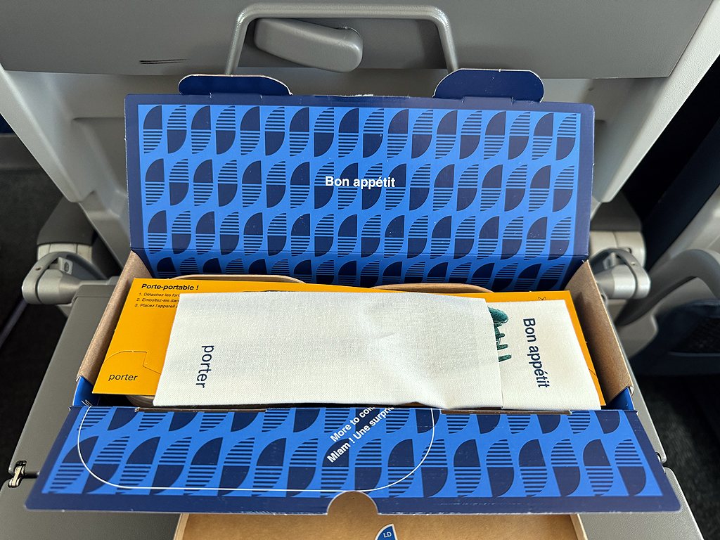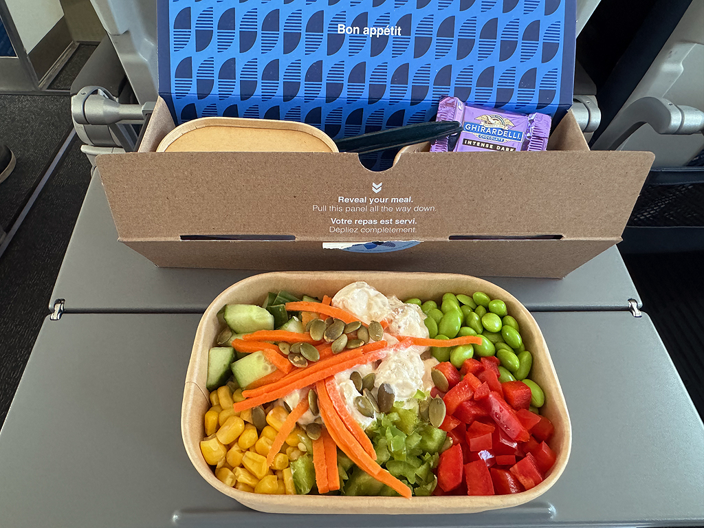 Auf der Strecke zwsichen Los Angeles und Toronto bietet Porter den vollen Service, das heißt, dass es zwei Mahlzeiten und alkoholische Getränke gibt. Kurz nach dem Start begann der Service mit einem Mittagessen. Dabei standen vier Gerichte zur Auswahl: Chicken Bowl, Vegetarian Noodle Bowl, Chicken Croissant und Piri Piri Chicken. Das Essen wurde dann in einer großen Pappschüssel serviert. Dazu gab es noch einen kleinen Pappkarton (Plane Brown Box) mit einem Salat und dem Nachtisch (Muffin und Schokolade). Neben dem Essen befand sich noch ein Pappaufsteller für ein Smartphone oder Tablet.