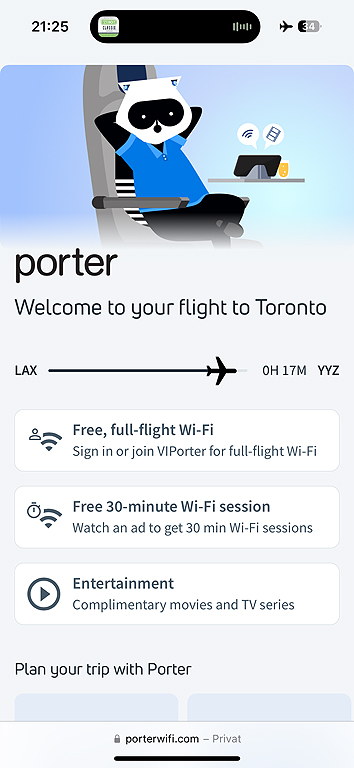 An Bord von Porter Airlines könnt Ihr über das Bord WiFi verschiedene Filme, Serien und Musik streamen. Außerdem könnt Ihr im Internet surfen. Entweder kostenpflichtig und dann zeitlich unbeschränkt oder immer wieder in paar Minuten gratis, wenn Ihr Euch vorher ein wenig Werbung anschaut.